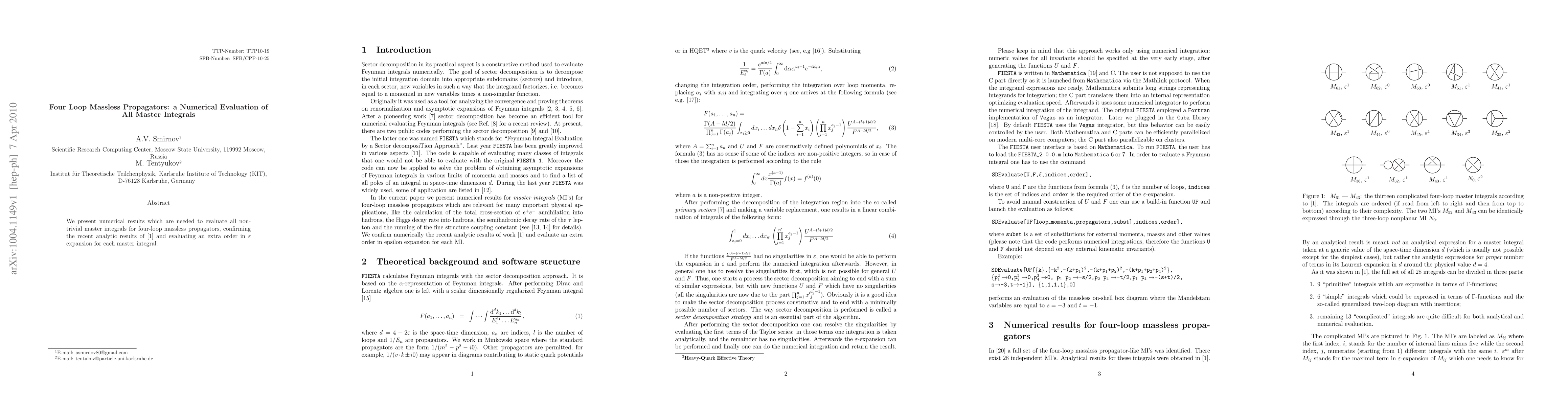 We present numerical results which are needed to evaluate all non-trivial master integrals for four-loop massless propagators, confirming the recent analytic results of[1]and evaluating an extra order in $\ep$ expansion for each master integral.