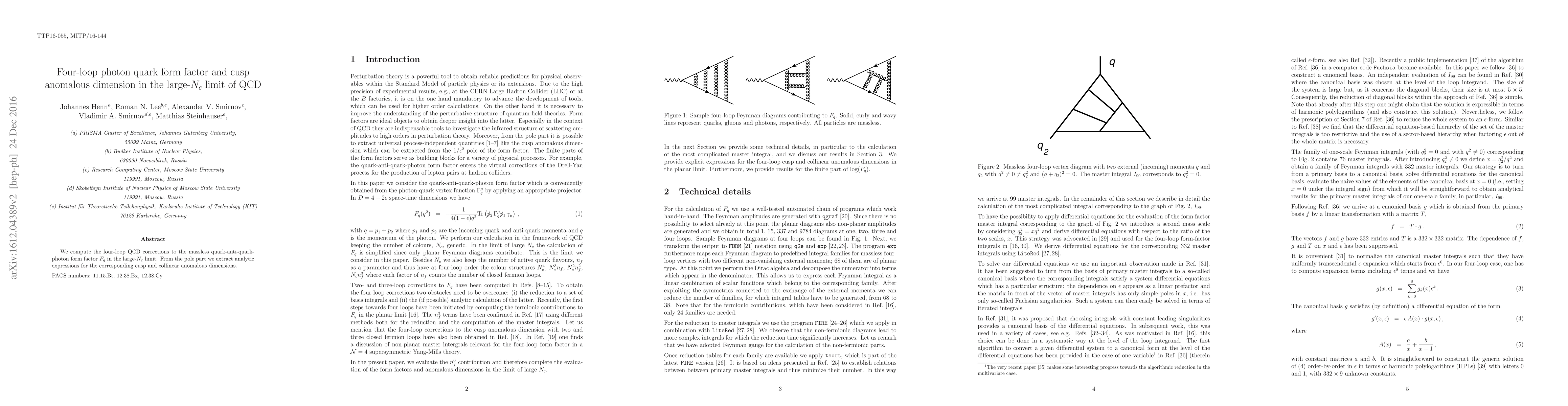 Researchers computed four-loop QCD corrections to a quark-photon form factor in the large-Nc limit, revealing analytic expressions for cusp and collinear anomalous dimensions.
