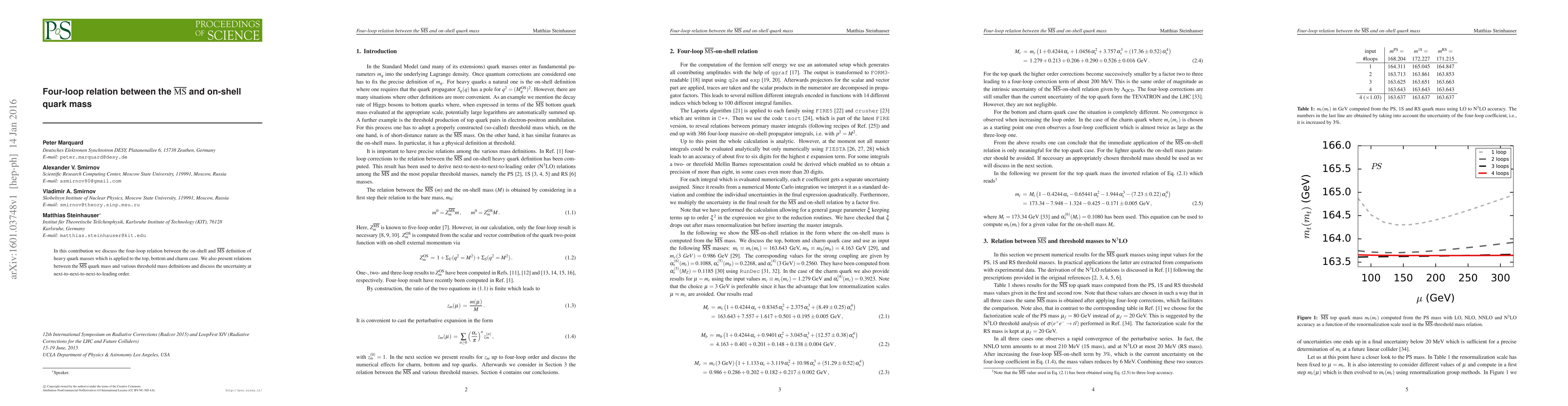 In this contribution we discuss the four-loop relation between the on-shell and $\bar{\rm MS}$ definition of heavy quark masses which is applied to the top, bottom and charm case. We also present relations between the $\bar{\rm MS}$ quark mass and various threshold mass definitions and discuss the uncertainty at next-to-next-to-next-to-leading order.