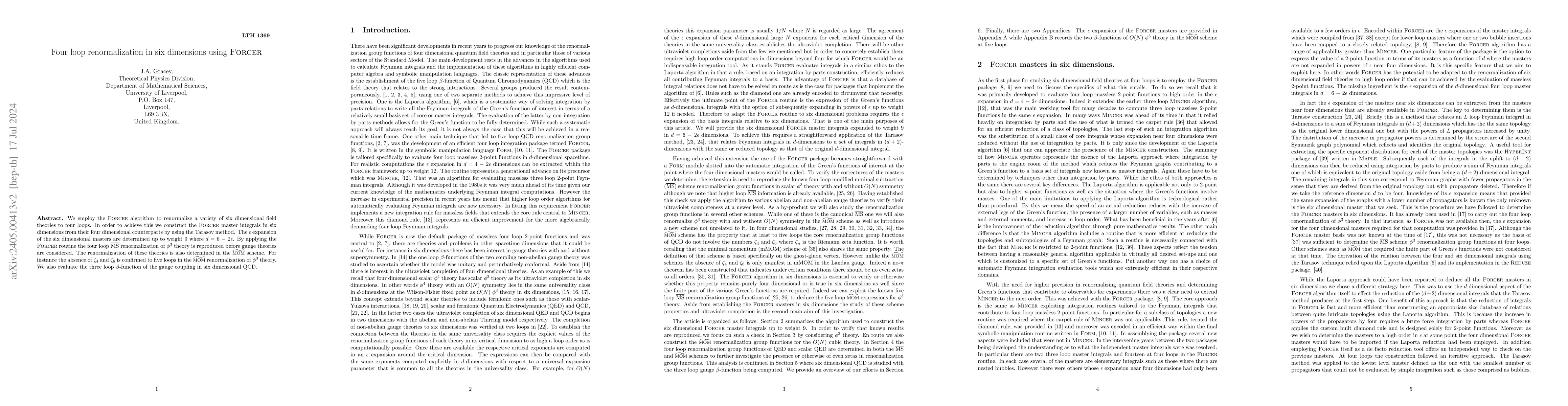 The research employs the Forcer algorithm to renormalize six-dimensional field theories to four loops, constructing the Forcer master integrals in six dimensions from their four-dimensional counterparts using the Tarasov method. The $\epsilon$ expansion of the six-dimensional masters is determined up to weight 9.