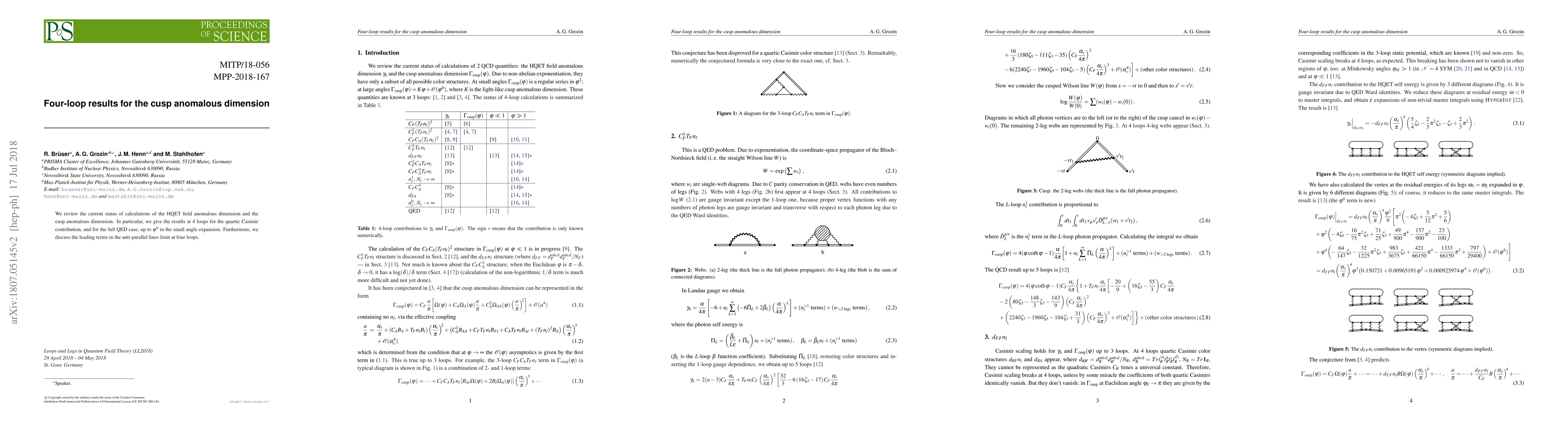 The paper presents detailed four-loop calculations for the cusp anomalous dimension, breaking Casimir scaling at this order, and provides a complete analytical expression for the QED cusp anomalous dimension up to ϕ⁶.
