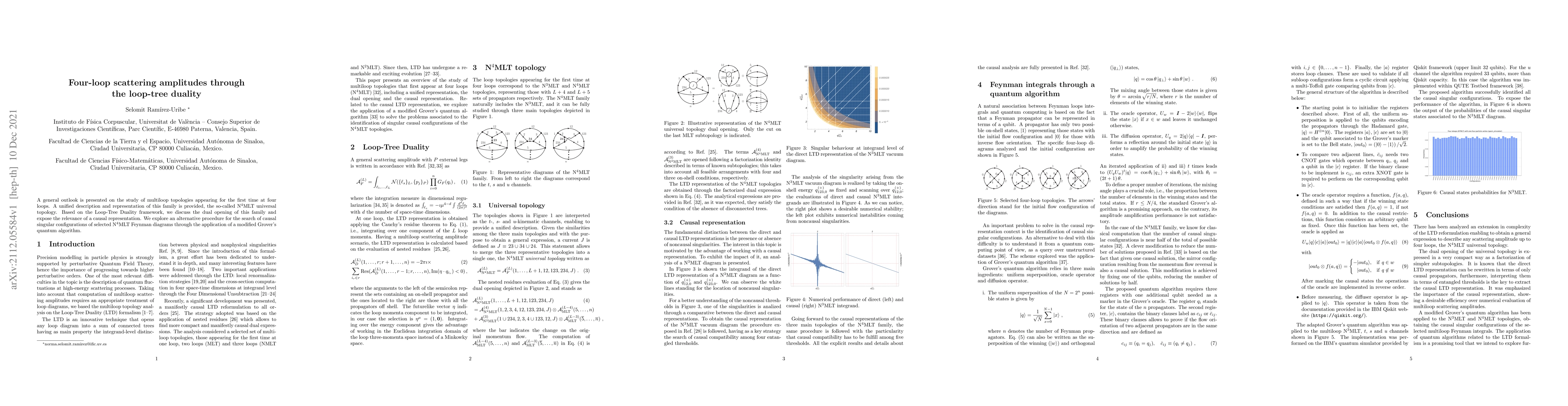 This paper introduces a unified representation for four-loop scattering amplitudes, termed N$^4$MLT universal topology, and explores its dual opening via the Loop-Tree Duality framework. It also proposes a modified Grover's quantum algorithm to identify causal singular configurations in selected Feynman diagrams.
