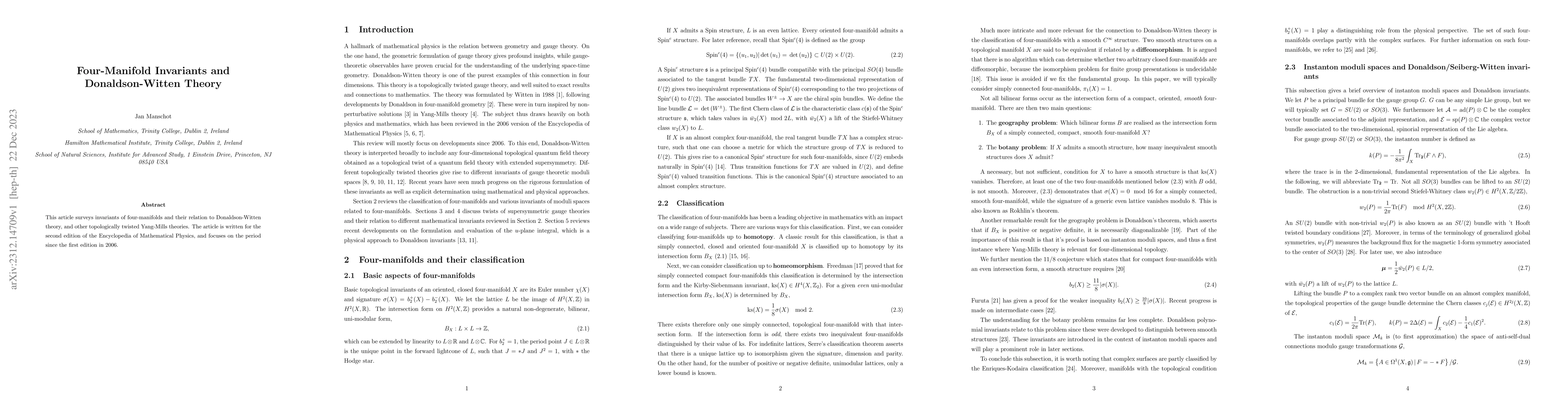 This paper surveys invariants of four-manifolds, emphasizing their connections to Donaldson-Witten theory and other topologically twisted Yang-Mills theories, with a focus on developments since 2006. It aims to update the field for the second edition of the Encyclopedia of Mathematical Physics.