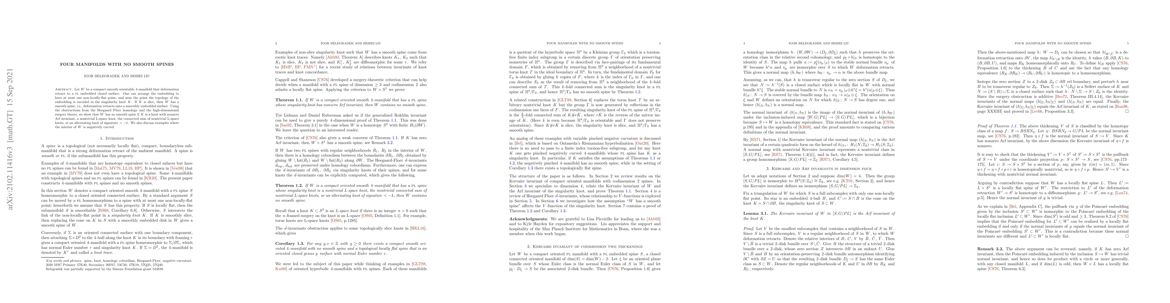 Let $W$ be a compact smooth $4$-manifold that deformation retract to a PL embedded closed surface. One can arrange the embedding to have at most one non-locally-flat point, and near the point the topology of the embedding is encoded in the singularity knot $K$. If $K$ is slice, then $W$ has a smooth spine, i.e., deformation retracts onto a smoothly embedded surface. Using the obstructions from the Heegaard Floer homology and the high-dimensional surgery theory, we show that $W$ has no smooth spines if $K$ is a knot with nonzero Arf invariant, a nontrivial L-space knot, the connected sum of nontrivial L-space knots, or an alternating knot of signature $<-4$. We also discuss examples where the interior of $W$ is negatively curved.