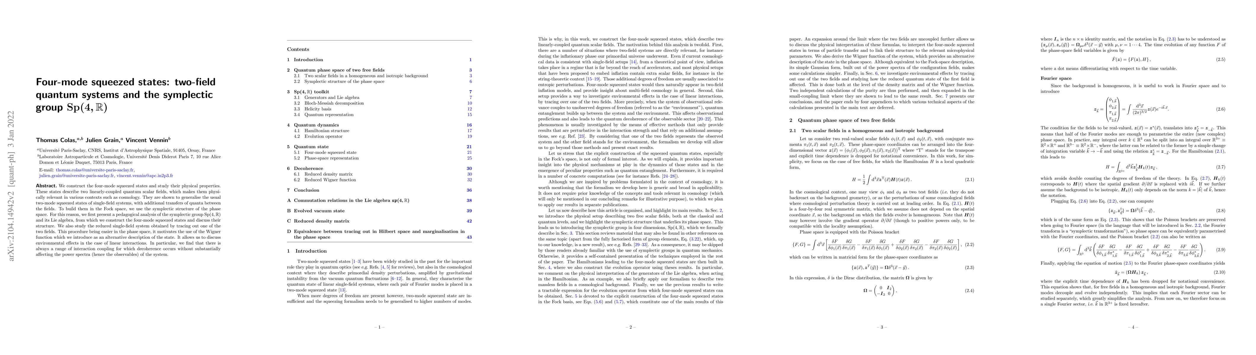 We construct the four-mode squeezed states and study their physical properties. These states describe two linearly-coupled quantum scalar fields, which makes them physically relevant in various contexts such as cosmology. They are shown to generalise the usual two-mode squeezed states of single-field systems, with additional transfers of quanta between the fields. To build them in the Fock space, we use the symplectic structure of the phase space. For this reason, we first present a pedagogical analysis of the symplectic group $\mathrm{Sp}(4,\mathbb{R})$ and its Lie algebra, from which we construct the four-mode squeezed states and discuss their structure. We also study the reduced single-field system obtained by tracing out one of the two fields. This procedure being easier in the phase space, it motivates the use of the Wigner function which we introduce as an alternative description of the state. It allows us to discuss environmental effects in the case of linear interactions. In particular, we find that there is always a range of interaction coupling for which decoherence occurs without substantially affecting the power spectra (hence the observables) of the system.