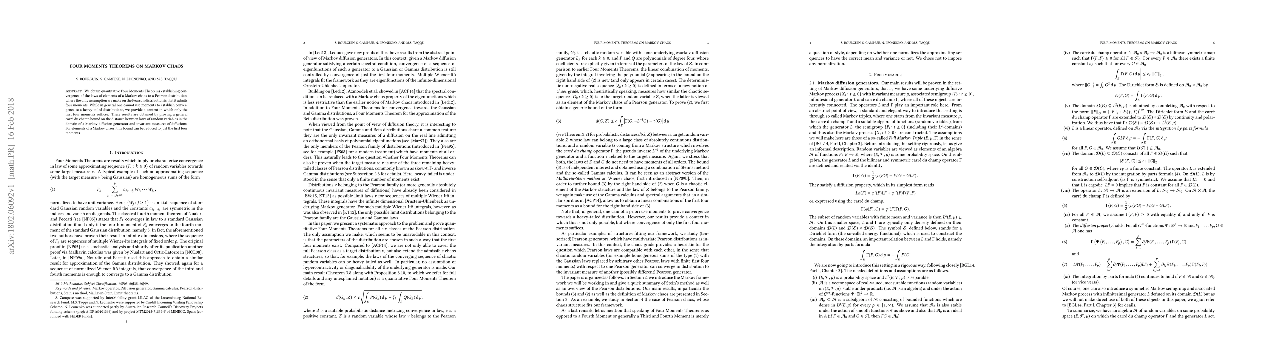 We obtain quantitative Four Moments Theorems establishing convergence of the laws of elements of a Markov chaos to a Pearson distribution, where the only assumption we make on the Pearson distribution is that it admits four moments. While in general one cannot use moments to establish convergence to a heavy-tailed distributions, we provide a context in which only the first four moments suffices. These results are obtained by proving a general carr\'e du champ bound on the distance between laws of random variables in the domain of a Markov diffusion generator and invariant measures of diffusions. For elements of a Markov chaos, this bound can be reduced to just the first four moments.