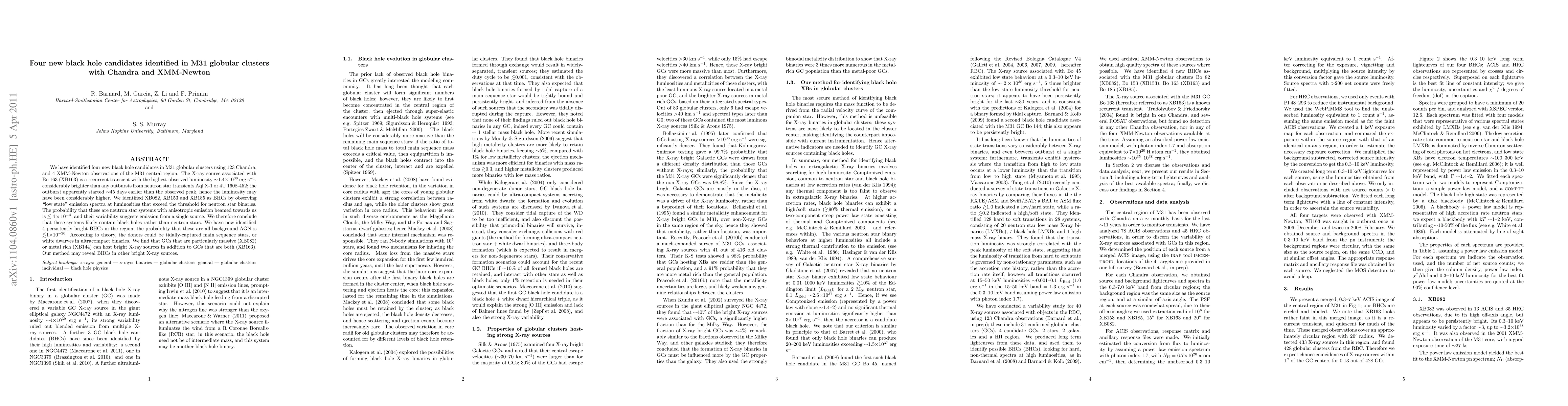 We have identified four new black hole candidates in M31 globular clusters using 123 Chandra, and 4 XMM-Newton observations of the M31 central region. The X-ray source associated with Bo 163 (XB163) is a recurrent transient, with the highest luminosity ~1.4E+38 erg/s, considerably brighter than any outbursts from the neutron star transients Aql X-1 or 4U 1608-452; the outburst apparently started ~45 days earlier than the observed peak, hence the luminosity could have been considerably higher. We identified XB082, XB153 and XB185 as BHCs by observing "low state" emission spectra at luminosities that exceed the threshold for neutron star binaries. The probability that these are neutron star systems with anisotropic emission beamed toward us is <4E-4, and their variability suggests emission from a single source. We therefore conclude that these systems likely contain black holes rather than neutron stars. We have now identified 4 persistently bright BHCs in the region; the probability that these are all background AGN is <1E-20. According to theory, the donors could be tidally captured main sequence stars, or white dwarves in ultra-compact binaries. We find that GCs that are particularly massive (XB082) or metal rich (XB144) can host bright X-ray sources in addition to those that are both (XB163). Our method may reveal BHCs in other bright X-ray sources.