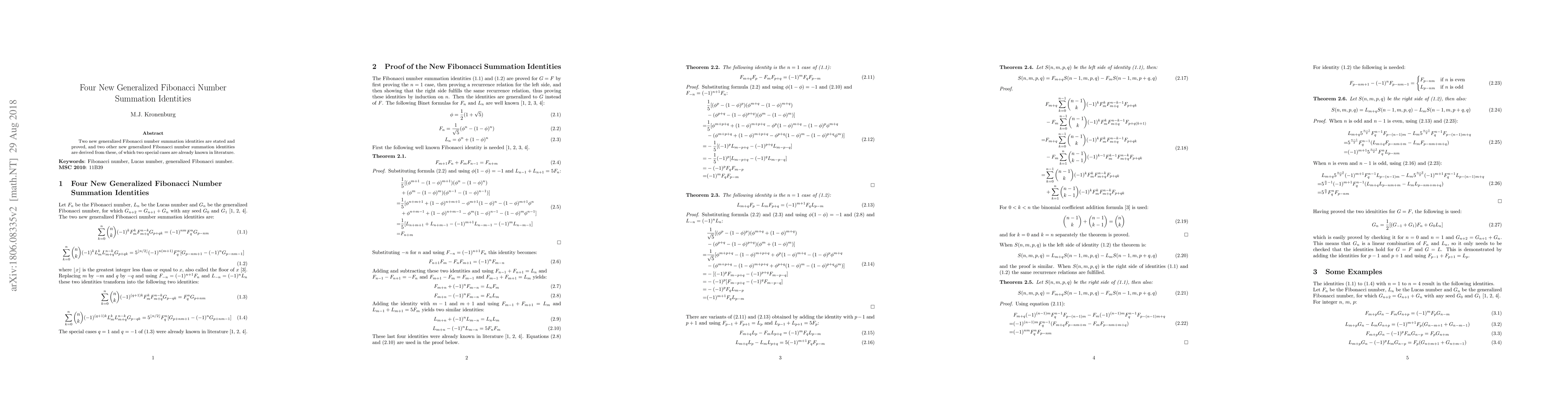 This paper introduces two new generalized Fibonacci number summation identities and derives two additional identities from them, noting that two special cases of the latter are already documented in existing literature.