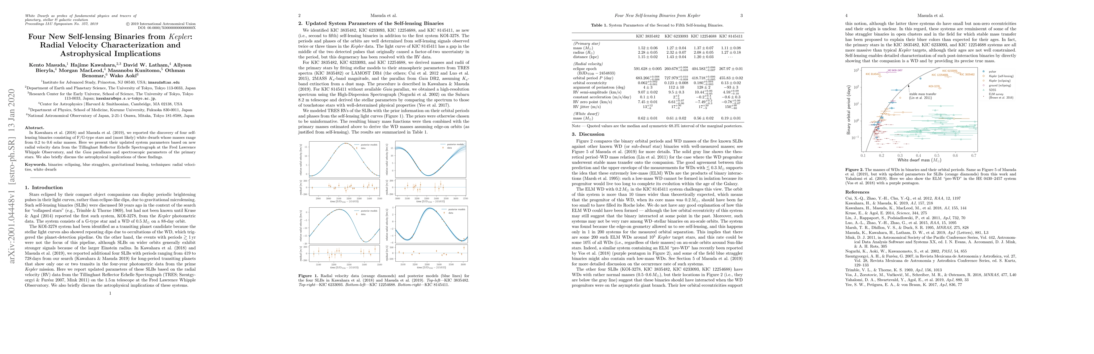 In Kawahara et al. (2018) and Masuda et al. (2019), we reported the discovery of four self-lensing binaries consisting of F/G-type stars and (most likely) white dwarfs whose masses range from 0.2 to 0.6 solar masses. Here we present their updated system parameters based on new radial velocity data from the Tillinghast Reflector Echelle Spectrograph at the Fred Lawrence Whipple Observatory, and the Gaia parallaxes and spectroscopic parameters of the primary stars. We also briefly discuss the astrophysical implications of these findings.