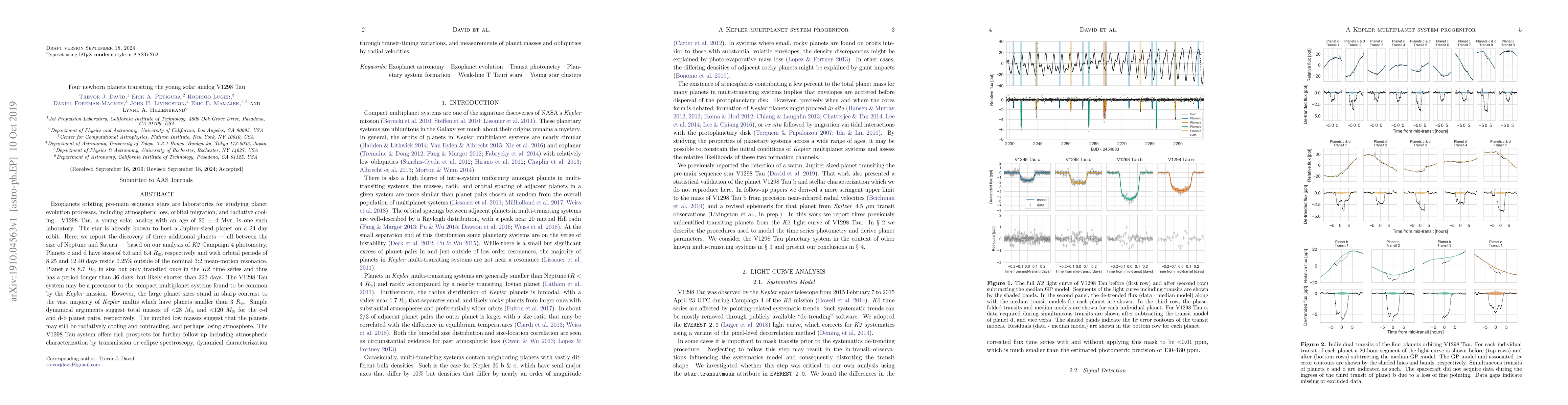 The V1298 Tau system, a young solar analog, hosts four transiting planets, including three newly discovered Neptune-to-Saturn-sized planets. The system provides insights into planet evolution, with potential for atmospheric studies and dynamical characterization.