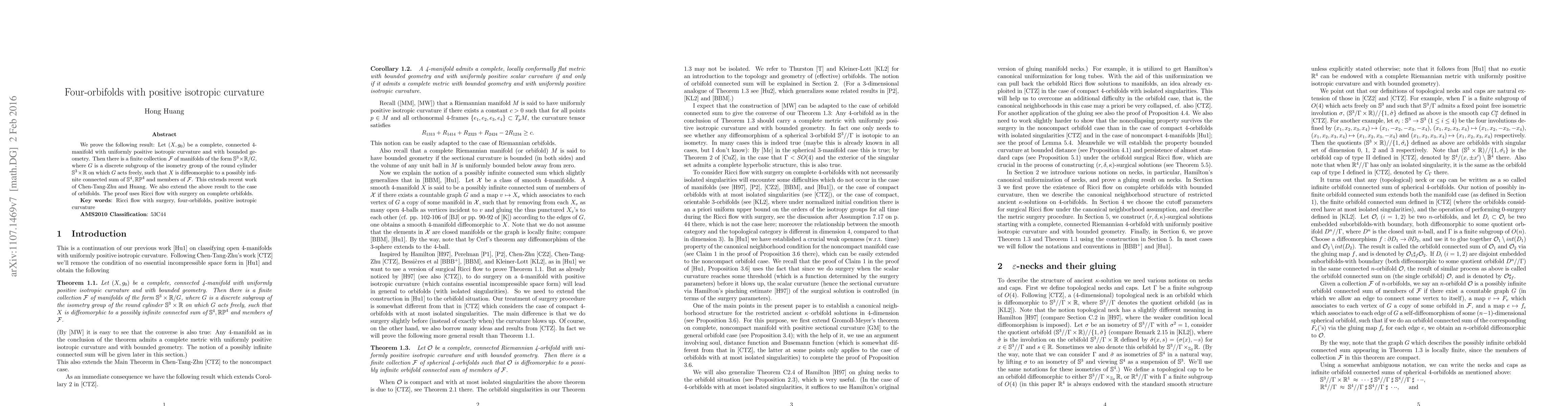 The paper proves that a complete 4-manifold with uniformly positive isotropic curvature and bounded geometry can be expressed as a connected sum of $\mathbb{S}^4$, $\mathbb{RP}^4$, and certain $\mathbb{S}^3 \times \mathbb{R}/G$ orbifolds. The method employs Ricci flow with surgery on orbifolds to achieve this result.