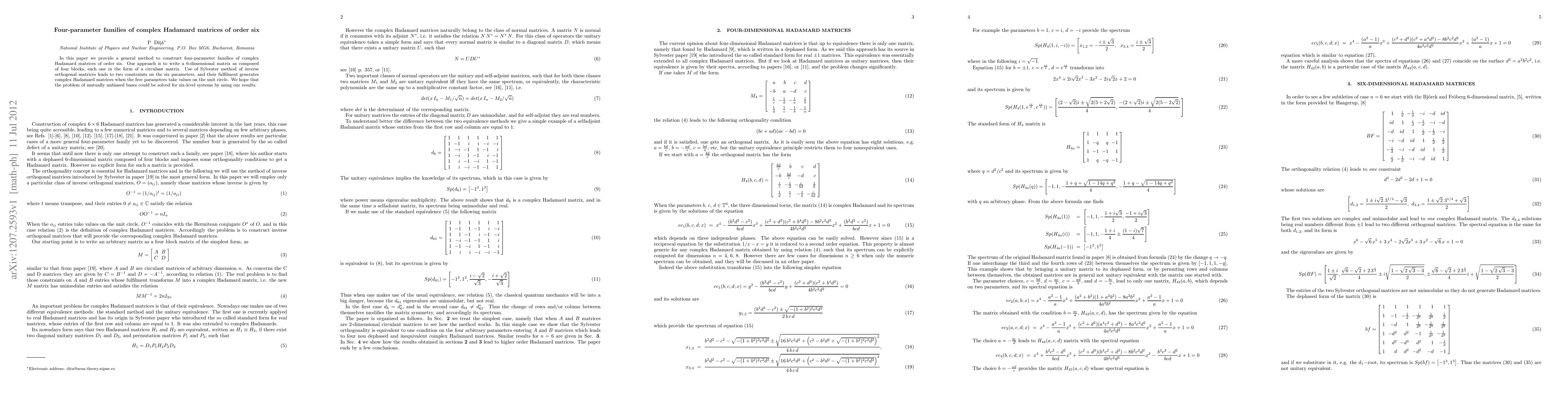This paper presents a method for constructing four-parameter families of complex Hadamard matrices of order six by decomposing a 6-dimensional matrix into four circulant blocks. The Sylvester method imposes constraints on the parameters, generating complex Hadamard matrices when they lie on the unit circle, potentially aiding in solving the problem of mutually unbiased bases for six-level systems.