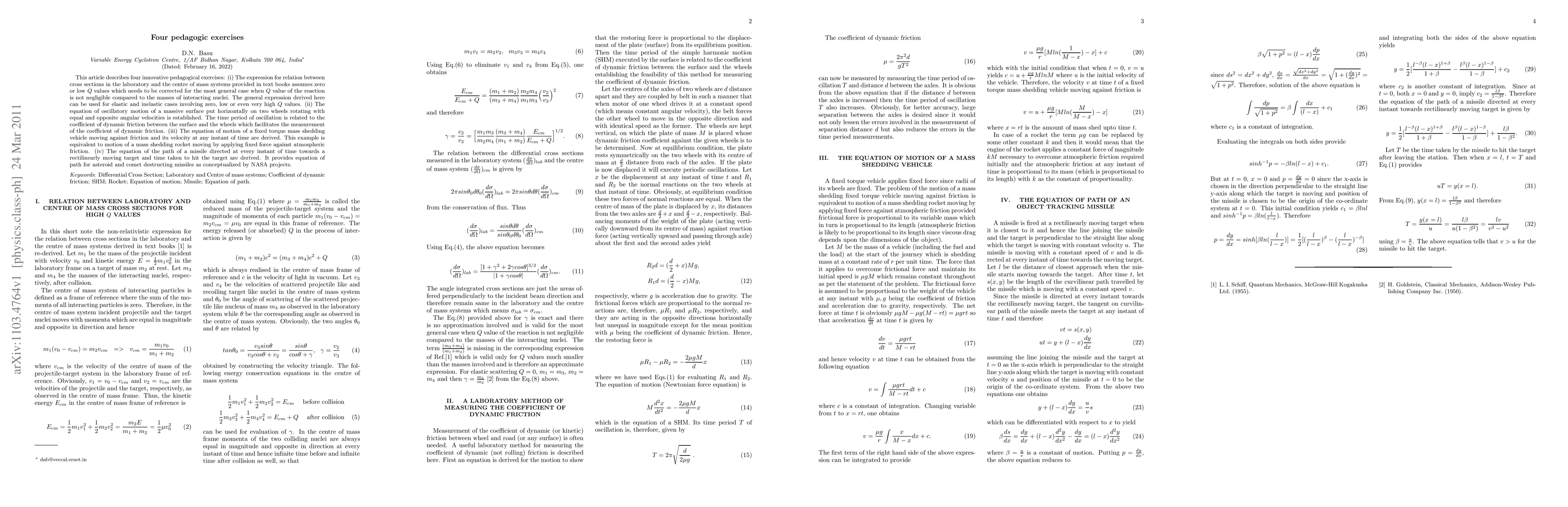 This article describes four innovative pedagogical exercises: (i) The expression for relation between cross sections in the laboratory and the centre of mass systems provided in text books assumes zero or low Q values which needs to be corrected for the most general case when Q value of the reaction is not negligible compared to the masses of interacting nuclei. The general expression derived here can be used for elastic and inelastic cases involving zero, low or even very high Q values. (ii) The equation of oscillatory motion of a massive surface put horizontally on two wheels rotating with equal and opposite angular velocities is established. The time period of oscillation is related to the coefficient of dynamic friction between the surface and the wheels which facilitates the measurement of the coefficient of dynamic friction. (iii) The equation of motion of a fixed torque mass shedding vehicle moving against friction and its velocity at any instant of time are derived. This example is equivalent to motion of a mass shedding rocket moving by applying fixed force against atmospheric friction. (iv) The equation of the path of a missile directed at every instant of time towards a rectilinearly moving target and time taken to hit the target are derived. It provides equation of path for asteroid and comet destructing missiles as conceptualized by NASA projects.