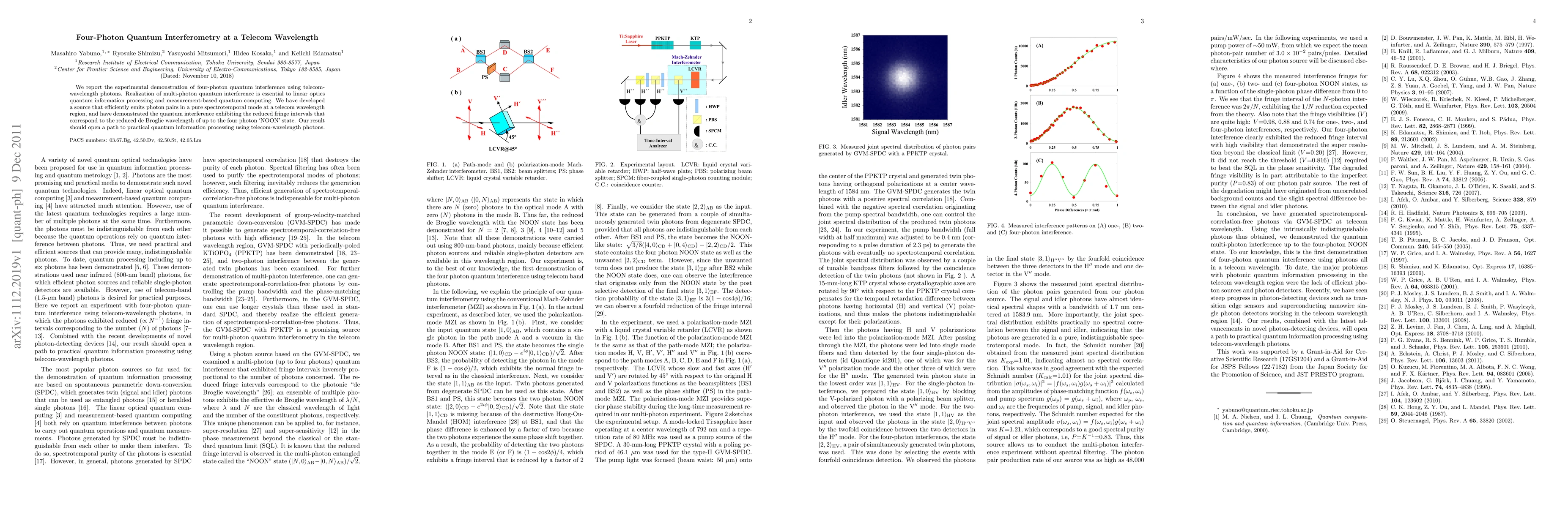 This paper reports the experimental realization of four-photon quantum interference using telecom-wavelength photons, essential for quantum information processing. The authors developed a source for pure spectrotemporal photon pairs and demonstrated quantum interference with reduced fringe intervals, paving the way for practical quantum computing in telecom wavelengths.