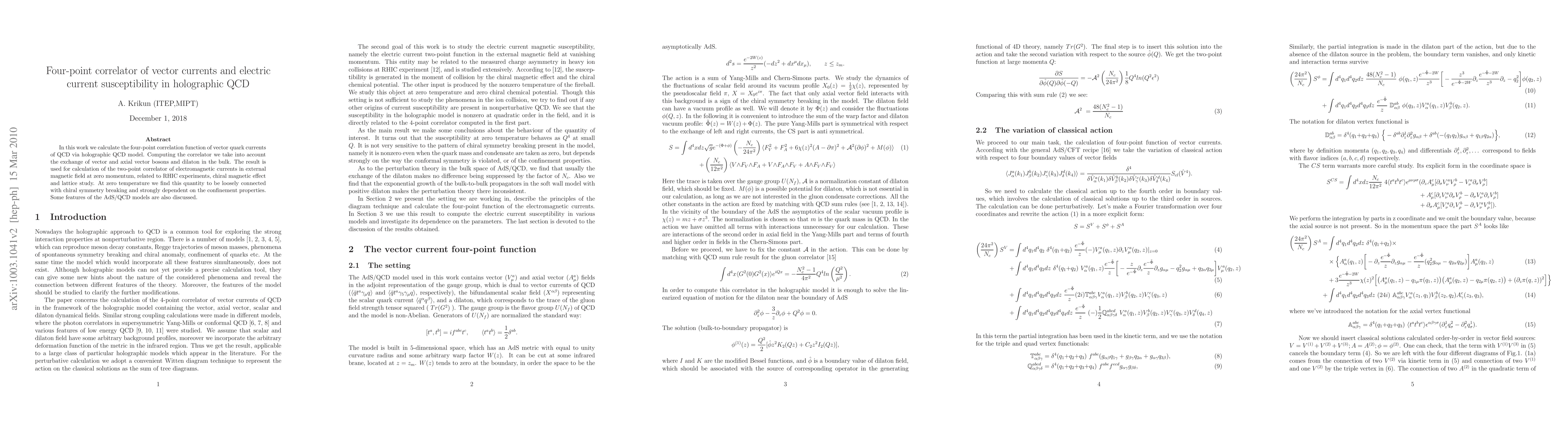 Researchers used a holographic QCD model to calculate the four-point correlation function of vector quark currents, finding that it is loosely connected to chiral symmetry breaking and dependent on confinement properties.