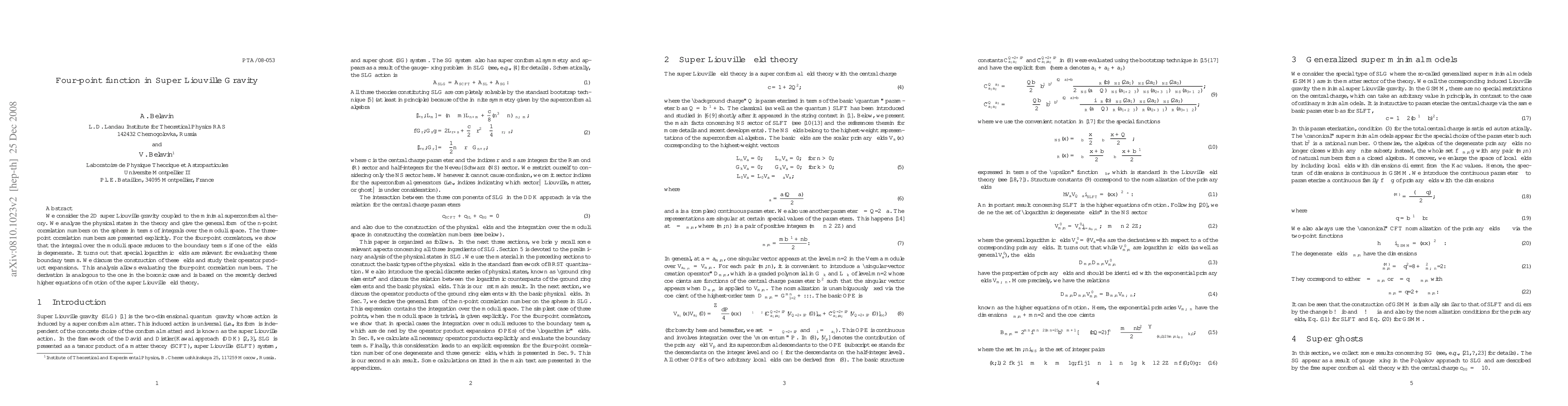 This paper investigates the four-point function in 2D super Liouville gravity coupled with minimal superconformal theory, deriving the n-point correlation numbers via integrals over moduli space. Special logarithmic fields are crucial for evaluating the four-point correlators, especially when one field is degenerate.