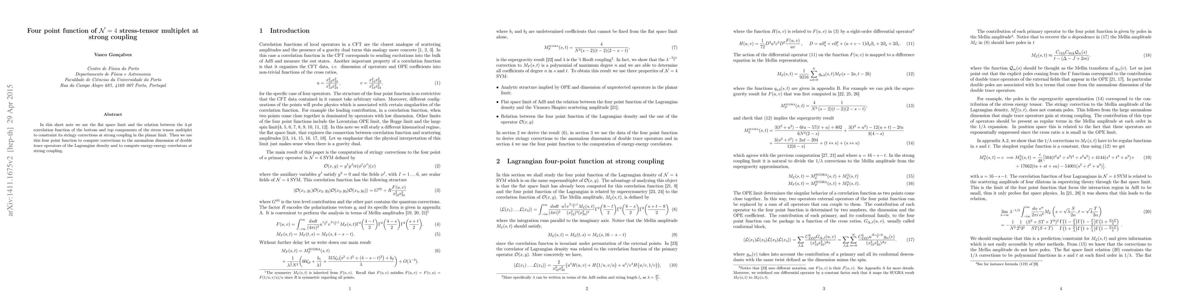 In this short note we use the flat space limit and the relation between the 4-pt correlation function of the bottom and top components of the stress tensor multiplet to constraint its stringy corrections at strong coupling in the planar limit. Then we use this four point function to compute corrections to the anomalous dimension of double trace operators of the Lagrangian density and to compute energy-energy correlators at strong coupling.