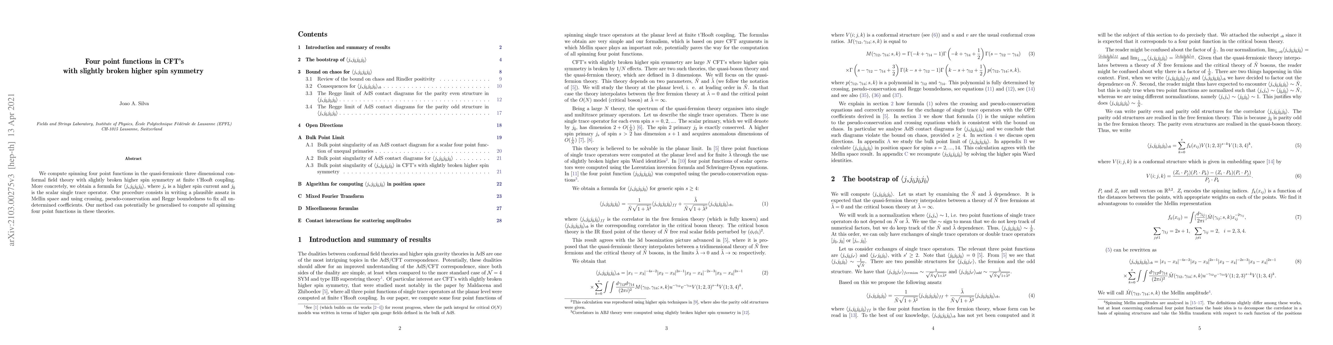 We compute spinning four point functions in the quasi-fermionic three dimensional conformal field theory with slightly broken higher spin symmetry at finite t'Hooft coupling. More concretely, we obtain a formula for $\langle j_s j_{\tilde{0}} j_{\tilde{0}} j_{\tilde{0}} \rangle$, where $j_s$ is a higher spin current and $j_{\tilde{0}}$ is the scalar single trace operator. Our procedure consists in writing a plausible ansatz in Mellin space and using crossing, pseudo-conservation and Regge boundedness to fix all undetermined coefficients. Our method can potentially be generalised to compute all spinning four point functions in these theories.