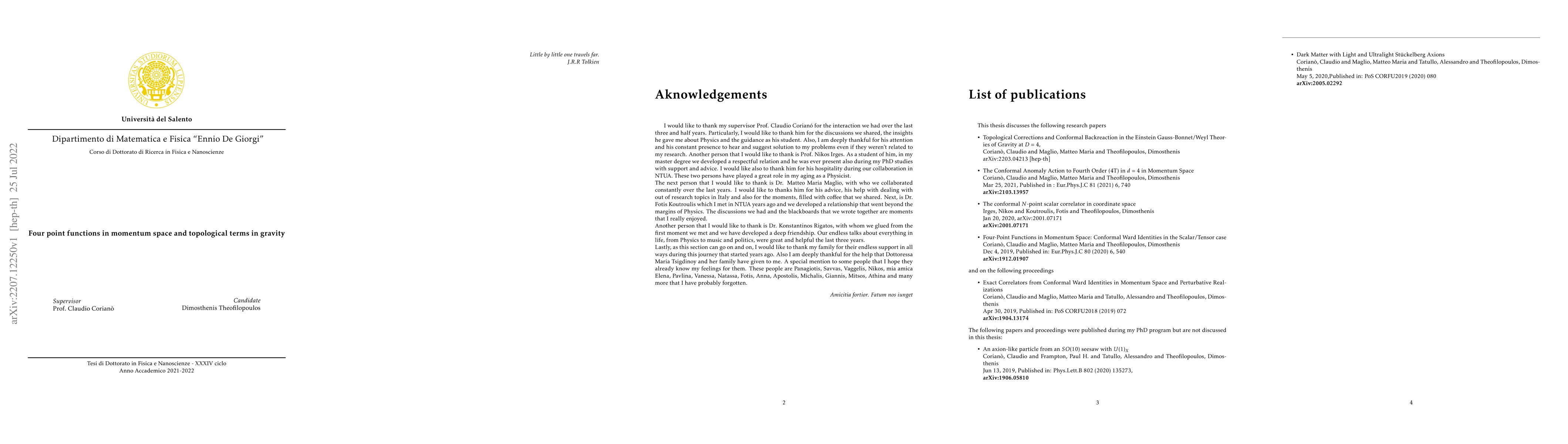 In the first part, we concentrate on CFTs in coordinate space. We lay the foundations of Conformal Field Theory and we also demonstrate a method where by using the embedding formalism we can derive up to n-point scalar conformal correlators. We proceed with our analysis in momentum space and we illustrate the theory of the conformal anomalies. We move on to analyse the renormalization of the correlators through counterterms followed by a discussion of the anomaly action. In the second part of the thesis. we derive and analyze the conformal Ward identities (CWIs) of a tensorial 4-point function of a generic CFT in momentum space. The correlator involves the stress-energy tensor $T$ and three scalar operators $O$ ($TOOO$). We derive the structure of the corresponding CWIs in two different sets of variables, relevant for the analysis of the 1-to-3 (1 graviton $\to$ 3 scalars) and 2-to-2 (graviton + scalar $\to$ two scalars) scattering processes. Then, we move on to another conformal correlator, the one made of four stress-energy tensors. We elaborate on the structure of the conformal anomaly effective action up to 4-th order, in an expansion in the gravitational fluctuations $(h)$ of the background metric, in the flat spacetime limit. We discuss the renormalization of 4-point functions containing insertions of stress-energy tensors (4T), in conformal field theories in four spacetime dimensions. Finally, we include an analysis on the topological terms that are involved in the renormalization and consequently corrections of gravitational theories.