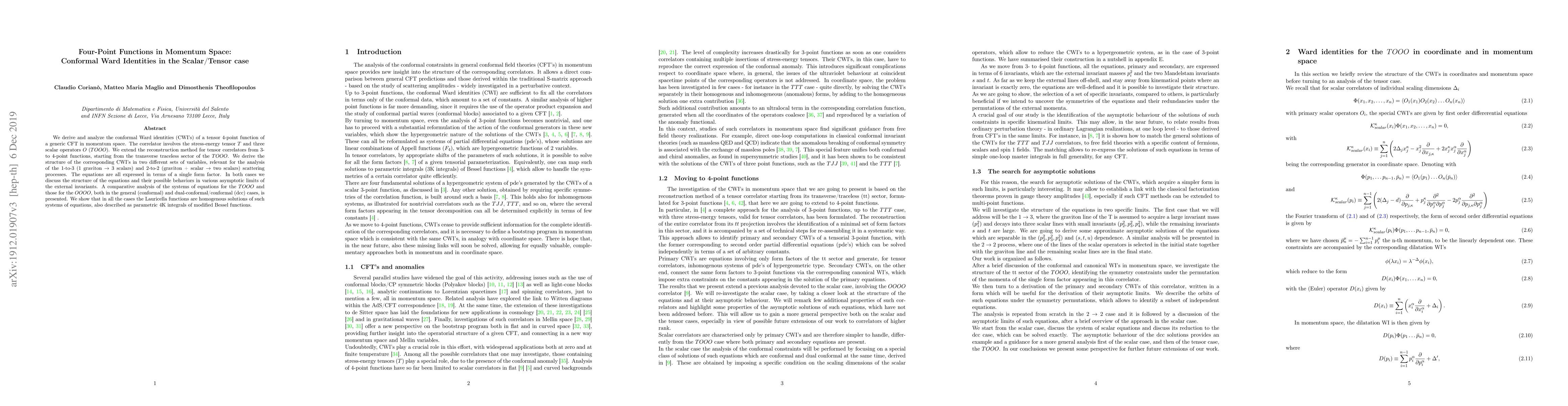 We derive and analyze the conformal Ward identities (CWI's) of a tensor 4-point function of a generic CFT in momentum space. The correlator involves the stress-energy tensor $T$ and three scalar operators $O$ ($TOOO$). We extend the reconstruction method for tensor correlators from 3- to 4-point functions, starting from the transverse traceless sector of the $TOOO$. We derive the structure of the corresponding CWI's in two different sets of variables, relevant for the analysis of the 1-to-3 (1 graviton $\to$ 3 scalars) and 2-to-2 (graviton + scalar $\to$ two scalars) scattering processes. The equations are all expressed in terms of a single form factor. In both cases, we discuss the structure of the equations and their possible behaviors in various asymptotic limits of the external invariants. A comparative analysis of the systems of equations for the $TOOO$ and those for the $OOOO$, both in the general (conformal) and dual-conformal/conformal (dcc) cases, is presented. We show that in all the cases the Lauricella functions are homogenous solutions of such systems of equations, also described as parametric 4K integrals of modified Bessel functions.