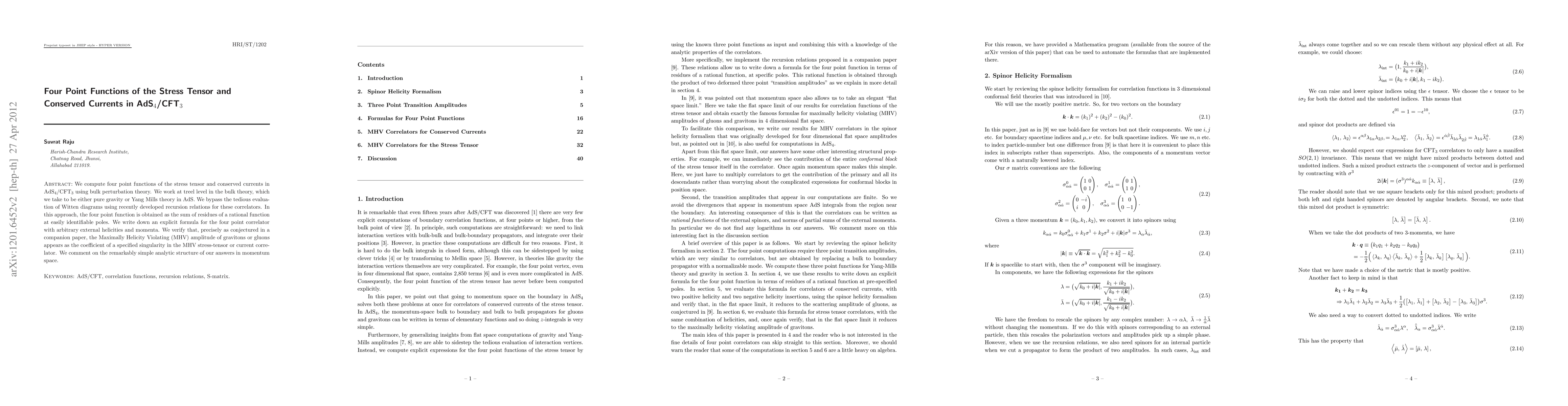We compute four point functions of the stress tensor and conserved currents in AdS_4/CFT_3 using bulk perturbation theory. We work at treel level in the bulk theory, which we take to be either pure gravity or Yang Mills theory in AdS. We bypass the tedious evaluation of Witten diagrams using recently developed recursion relations for these correlators. In this approach, the four point function is obtained as the sum of residues of a rational function at easily identifiable poles. We write down an explicit formula for the four point correlator with arbitrary external helicities and momenta. We verify that, precisely as conjectured in a companion paper, the Maximally Helicity Violating (MHV) amplitude of gravitons or gluons appears as the coefficient of a specified singularity in the MHV stress-tensor or current correlator. We comment on the remarkably simple analytic structure of our answers in momentum space.