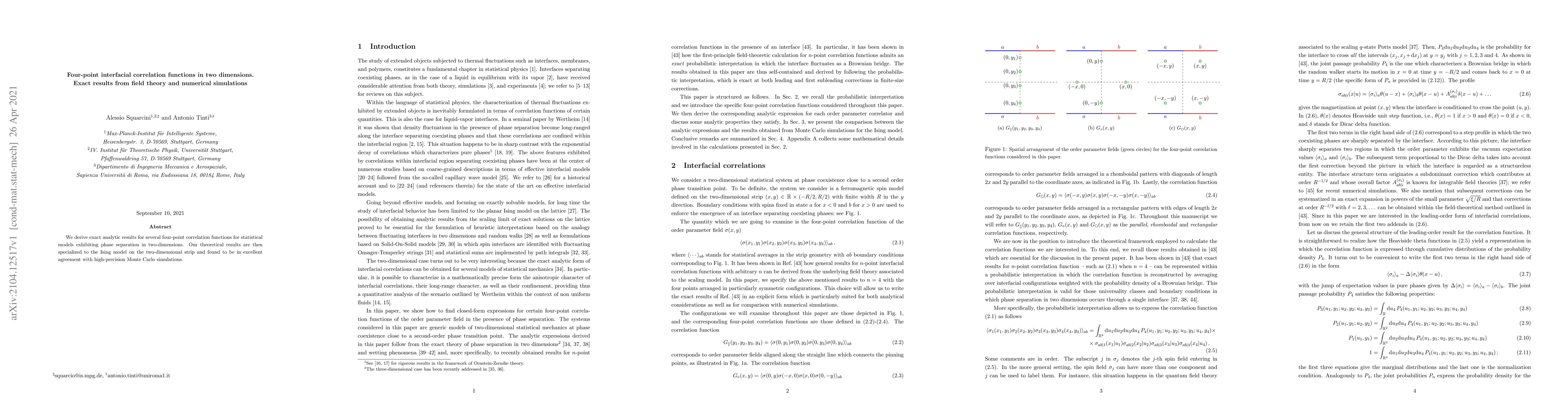 Researchers derived exact analytic results for four-point correlation functions in two-dimensional statistical models, confirming agreement with Monte Carlo simulations.
