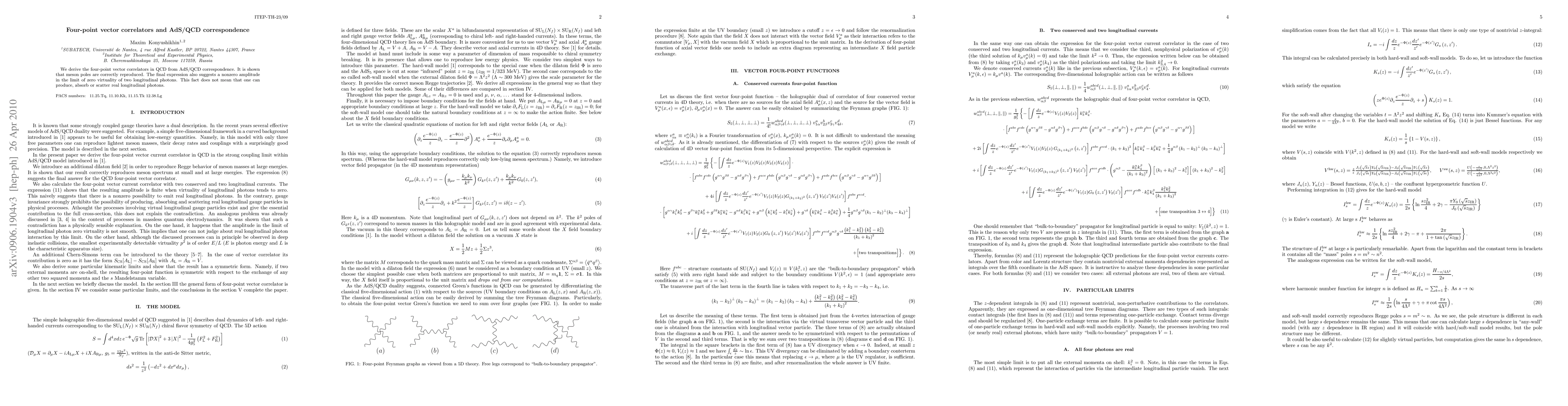 We derive the four-point vector correlators in QCD from AdS/QCD correspondence. It is shown that meson poles are correctly reproduced. The final expression also suggests a nonzero amplitude in the limit of zero virtuality of two longitudinal gluons. This fact does not mean that one can produce, absorb or scatter real longitudinal gluons.