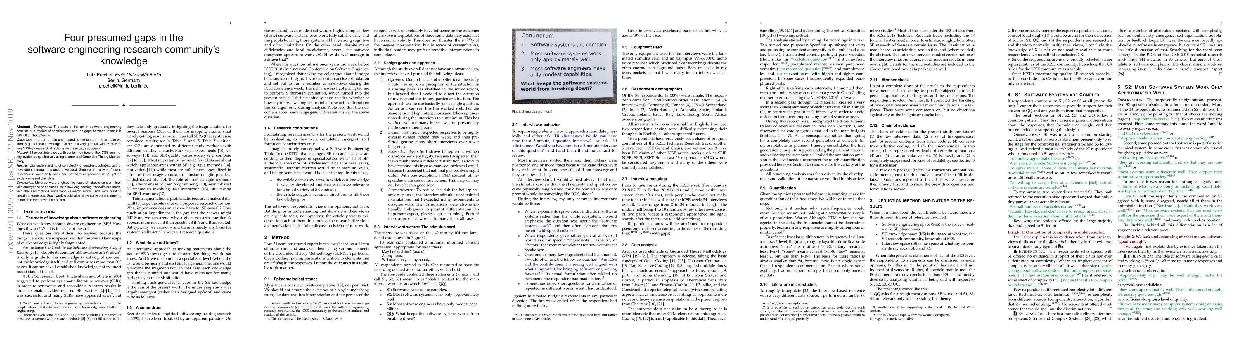 A study of 54 expert interviews found gaps in software engineering research, including a lack of understanding on complexity, good-enoughness, and developer strengths, highlighting the need for more evidence-based approaches to the field.