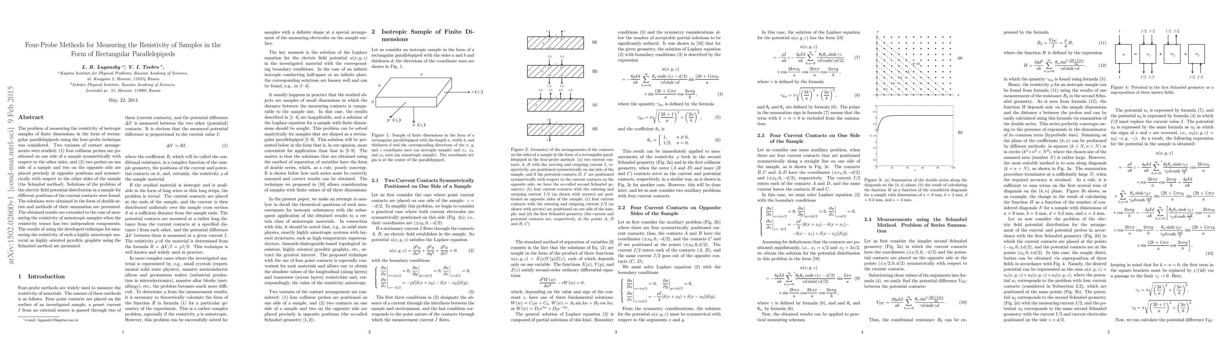 This paper investigates the four-probe method for measuring resistivity in rectangular parallelepiped samples, comparing two contact arrangements. It provides solutions for electric field potential distribution and extends the technique to anisotropic materials, demonstrating its application with highly oriented pyrolitic graphite.