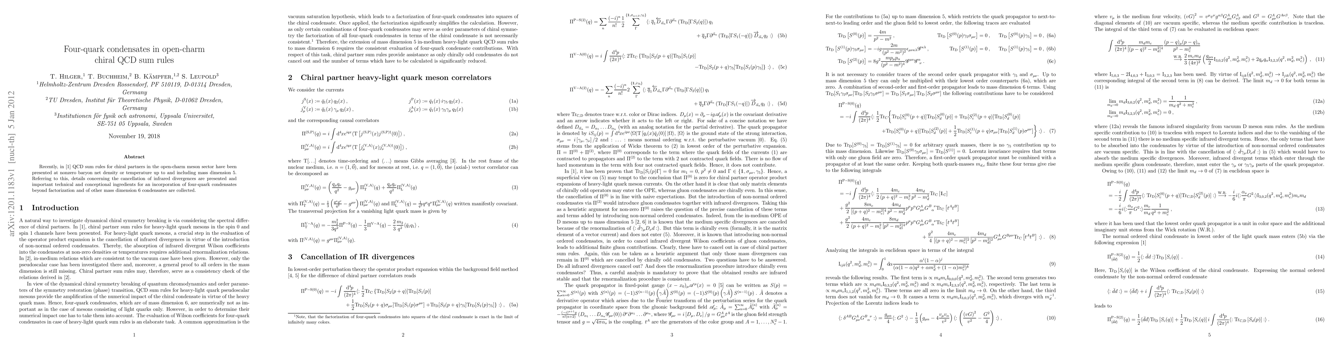 Recently, in Hilger et al. (2011) [1] QCD sum rules for chiral partners in the open-charm meson sector have been presented at nonzero baryon net density or temperature up to and including mass dimension 5. Referring to this, details concerning the cancelation of infrared divergences are presented and important technical and conceptional ingredients for an incorporation of four-quark condensates beyond factorization and of other mass dimension 6 condensates are collected.
