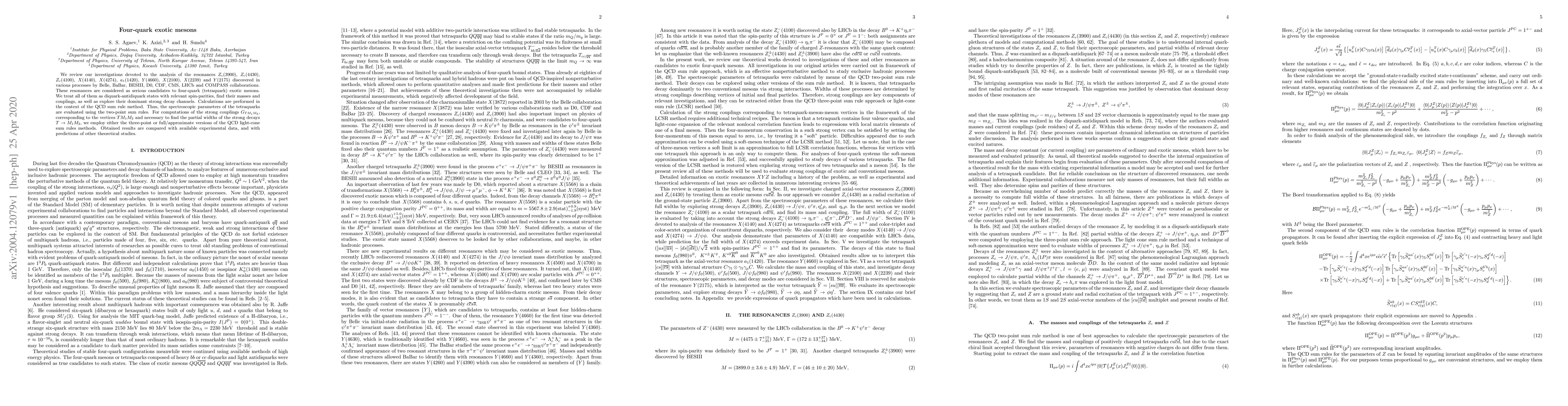 We review our investigations devoted to the analysis of the resonances $ Z_{c}(3900)$, $Z_{c}(4430)$, $Z_{c}(4100)$, $X(4140)$, $X(4274)$, $a_1(1420)$ , $Y(4660)$, $X(2100)$, $X(2239)$ and $Y(2175)$ discovered in various processes by Belle, BaBar, BESIII, D0, CDF, CMS, LHCb and COMPASS collaborations. These resonances are considered as serious candidates to four-quark (tetraquark) exotic mesons. We treat all of them as diquark-antidiquark states with relevant spin-parities, find their masses and couplings, as well as explore their dominant strong decay channels. Calculations are performed in the context of the QCD sum rule method. Thus, the spectroscopic parameters of the tetraquarks are evaluated using the two-point sum rules. For computations of the strong couplings $G_{TM_1M_2}$, corresponding to the vertices $TM_1M_2$ and necessary to find the partial widths of the strong decays $T \to M_1M_2$, we employ either the three-point or full/approximate versions of the QCD light-cone sum rules methods. Obtained results are compared with available experimental data, and with predictions of other theoretical studies.