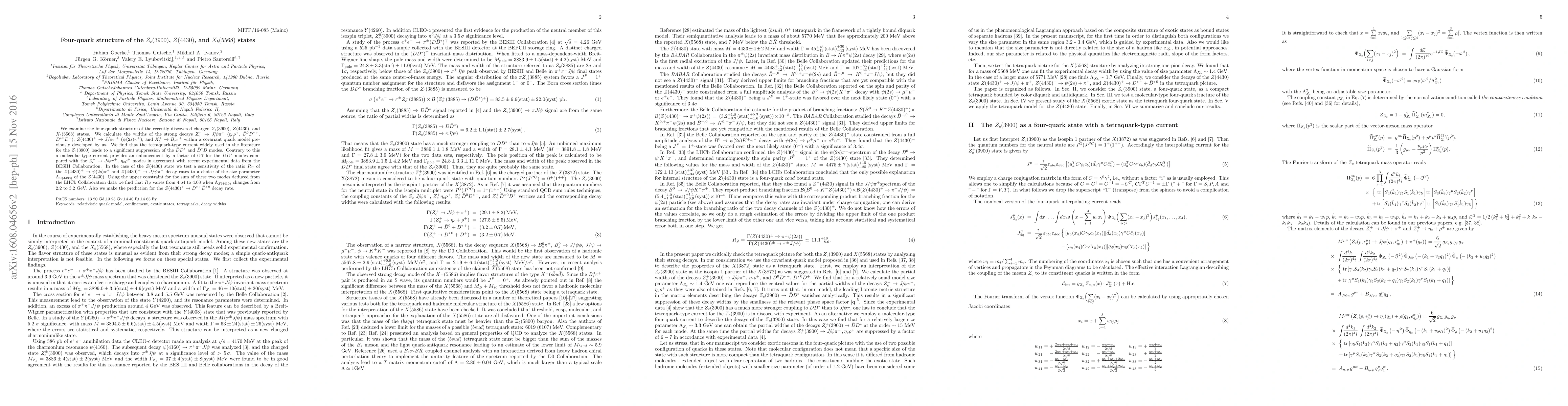 We examine the four-quark structure of the recently discovered charged $Z_c(3900)$, $Z(4430)$, and $X_b(5568)$ states. We calculate the widths of the strong decays $Z_c^+ \to J/\psi \pi^+$ ($\eta_c\rho^+$, $\bar D^0D^{\ast\,+}$, $\bar D^{\ast\,0}D^+$), $Z(4430)^+ \to J/\psi \pi^+$ ($\psi(2s) \pi^+$), and $X^+_b\to B_s\pi^+$ within a covariant quark model previously developed by us. We find that the tetraquark-type current widely used in the literature for the $Z_c(3900)$ leads to a significant suppression of the $\bar D D^\ast$ and $\bar D^\ast D$ modes. Contrary to this a molecular-type current provides an enhancement by a factor of 6-7 for the $\bar D D^\ast$ modes compared with the $Z_c^+\to J/\psi\pi^+$, $\eta_c\rho^+$ modes in agreement with recent experimental data from the BESIII Collaboration. In case of the $Z(4430)$ state we test a sensitivity of the ratio $R_Z$ of the $Z(4430)^+ \to \psi(2s) \pi^+$ and $Z(4430)^+ \to J/\psi \pi^+$ decay rates to a choice of the size parameter $\Lambda_{Z(4430)}$ of the $Z(4430)$. Using upper constraint for the sum of these two modes deduced from the LHCb Collaboration data we find that $R_Z$ varies from 4.64 to 4.08 when $\Lambda_{Z(4430)}$ changes from 2.2 to 3.2 GeV. Also we make the prediction for the $Z(4430)^+ \to D^{\ast\,+} \bar D^{\ast\,0}$ decay rate.