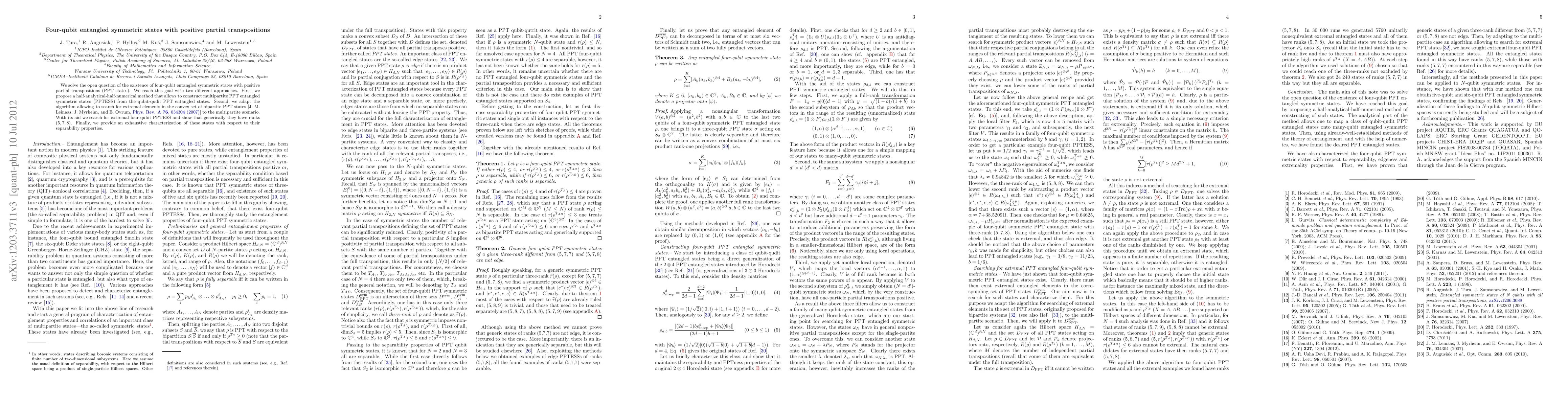 The paper confirms the existence of four-qubit entangled symmetric states with positive partial transpositions (PPT states) using two distinct methods: a hybrid analytical-numerical construction approach and an adapted algorithm for finding extremal elements in multipartite scenarios. It concludes that these states typically have ranks (5,7,8) and provides a thorough characterization of their separability properties.