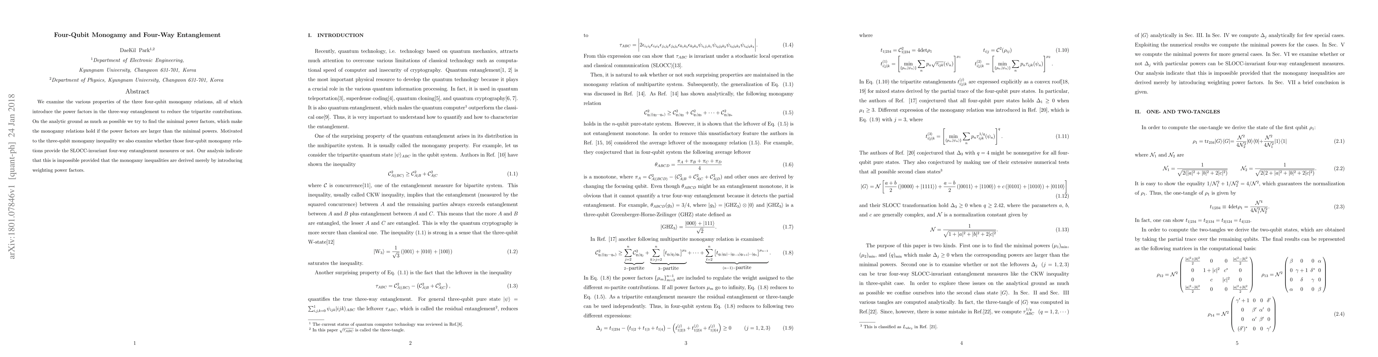 This paper investigates the monogamy relations for four-qubit systems, focusing on how power factors can minimize tripartite entanglement contributions. The study finds that these monogamy relations cannot yield SLOCC-invariant four-way entanglement measures when derived through weighting power factors.