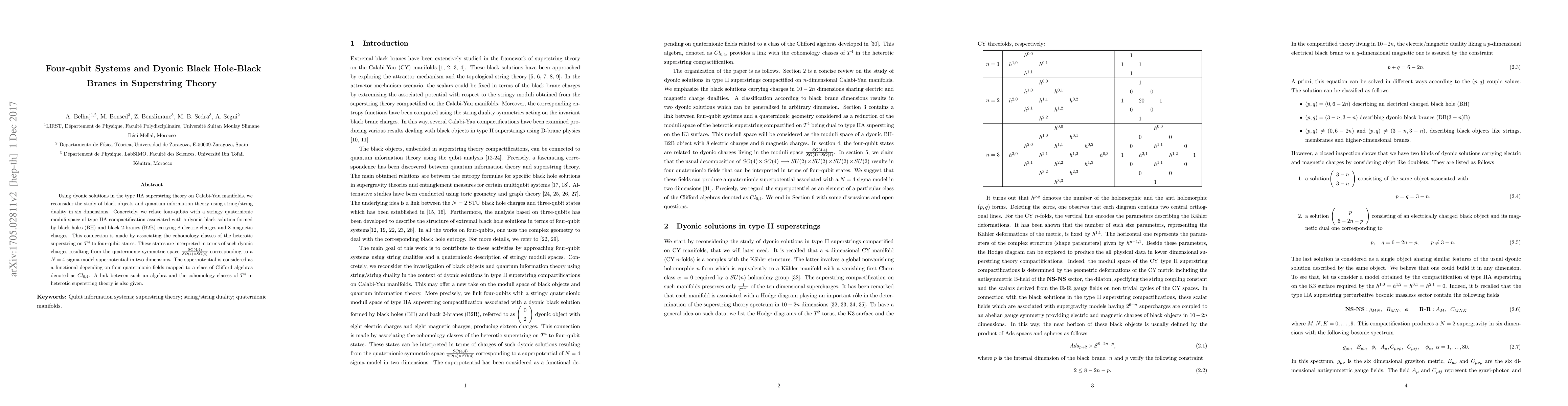 This paper connects four-qubit systems to dyonic black hole-black 2-brane solutions in type IIA superstring theory, utilizing string/string duality and quaternionic moduli spaces on Calabi-Yau manifolds. It establishes a relationship between four-qubit states and the charges of these black objects through the superpotential of a N=4 sigma model.
