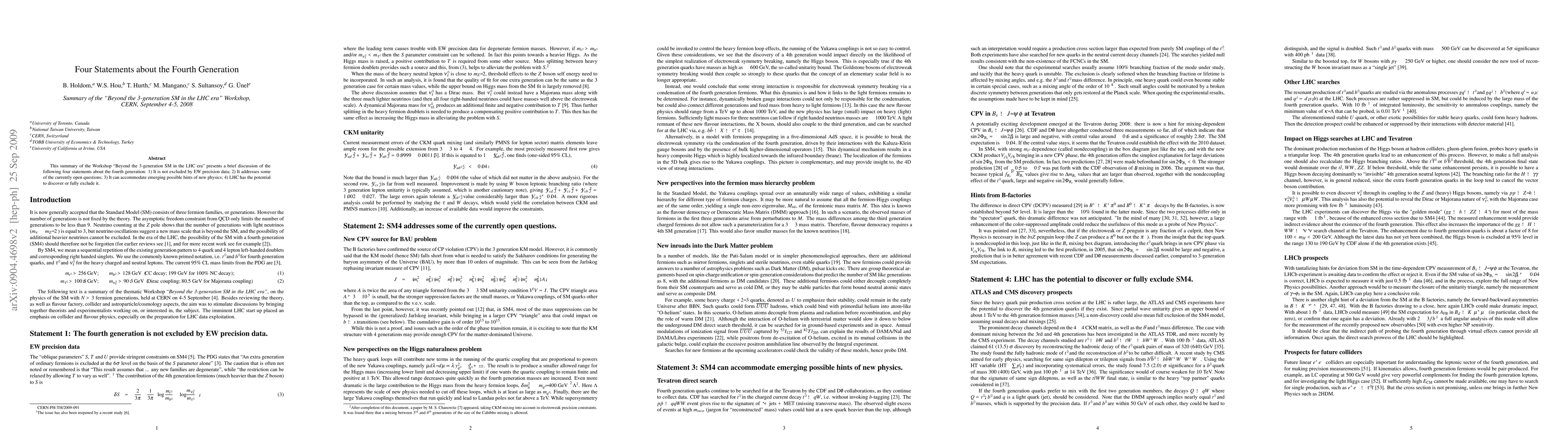 This summary of the Workshop "Beyond the 3-generation SM in the LHC era" presents a brief discussion of the following four statements about the fourth generation: 1) It is not excluded by EW precision data; 2) It addresses some of the currently open questions; 3) It can accommodate emerging possible hints of new physics; 4) LHC has the potential to discover or fully exclude it.
