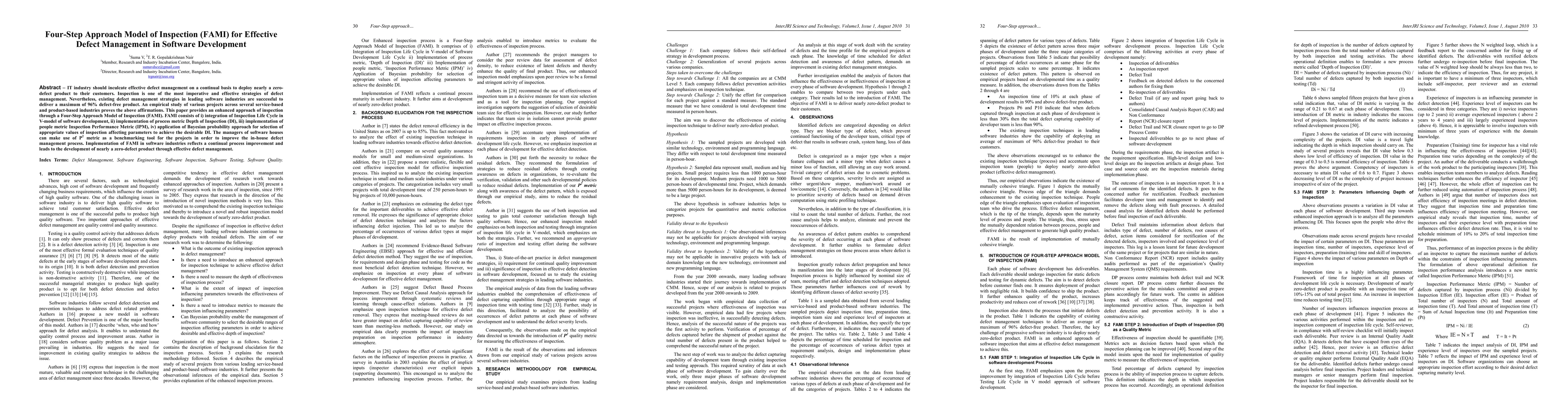 IT industry should inculcate effective defect management on a continual basis to deploy nearly a zerodefect product to their customers. Inspection is one of the most imperative and effective strategies of defect management. Nevertheless, existing defect management strategies in leading software industries are successful to deliver a maximum of 96% defect-free product. An empirical study of various projects across several service-based and product-based industries proves the above affirmations. This paper provides an enhanced approach of inspection through a Four-Step Approach Model of Inspection (FAMI). FAMI consists of i) integration of Inspection Life Cycle in V-model of software development, ii) implementation of process metric Depth of Inspection (DI), iii) implementation of people metric Inspection Performance Metric (IPM), iv) application of Bayesian probability approach for selection of appropriate values of inspection affecting parameters to achieve the desirable DI. The managers of software houses can make use of P2 metric as a benchmarking tool for the projects in order to improve the in-house defect management process. Implementation of FAMI in software industries reflects a continual process improvement and leads to the development of nearly a zero-defect product through effective defect management.