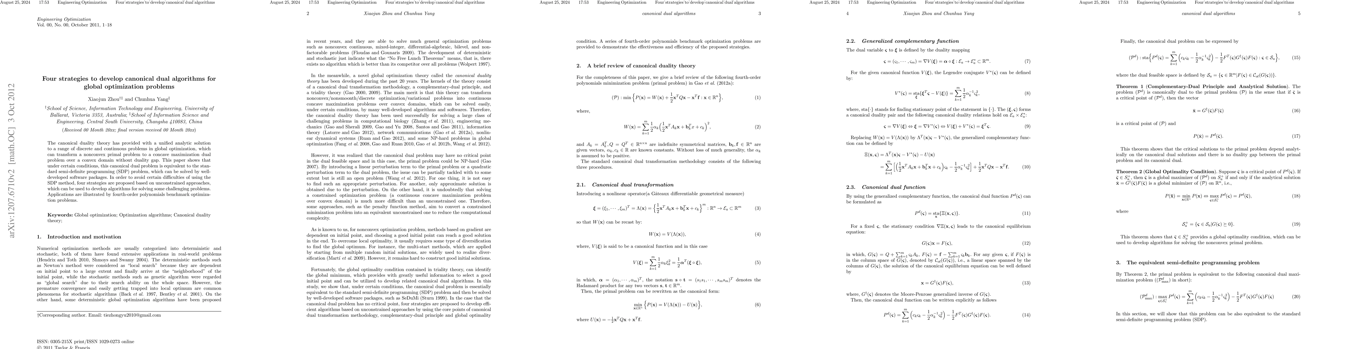 The canonical duality theory has provided with a unified analytic solution to a range of discrete and continuous problems in global optimization, which can transform a nonconvex primal problem to a concave maximization dual problem over a convex domain without duality gap. This paper shows that under certain conditions, this canonical dual problem is equivalent to the standard semi-definite programming (SDP) problem, which can be solved by well-developed software packages. In order to avoid certain difficulties of using the SDP method, four strategies are proposed based on unconstrained approaches, which can be used to develop algorithms for solving some challenging problems. Applications are illustrated by fourth-order polynomials benchmark optimization problems.