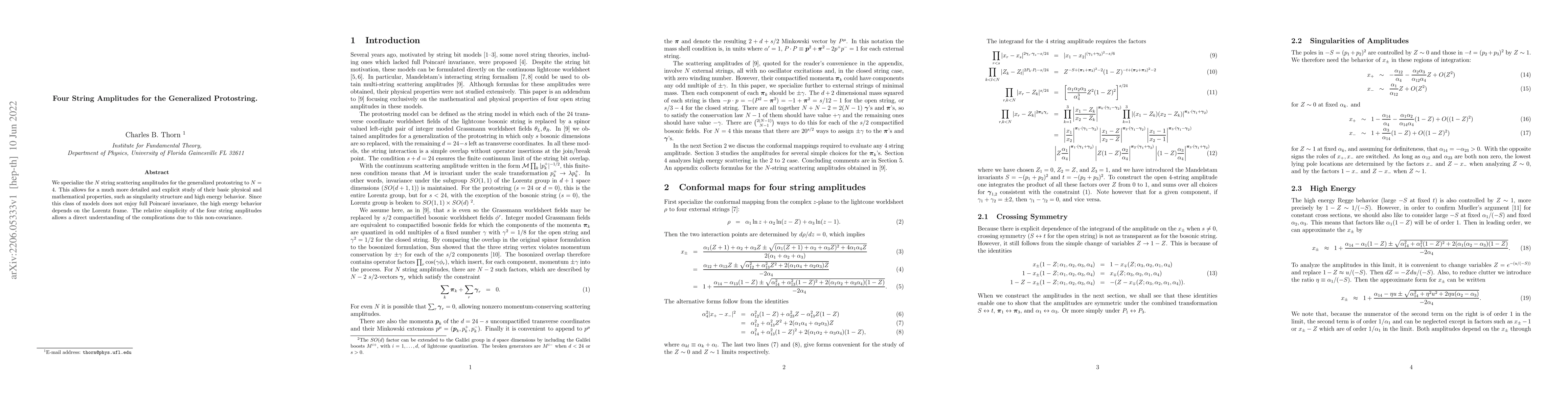 Researchers specialized the $N=4$ string scattering amplitudes for the generalized protostring to study its physical properties and high energy behavior. The simplified model reveals complications due to non-covariance in Lorentz frames.