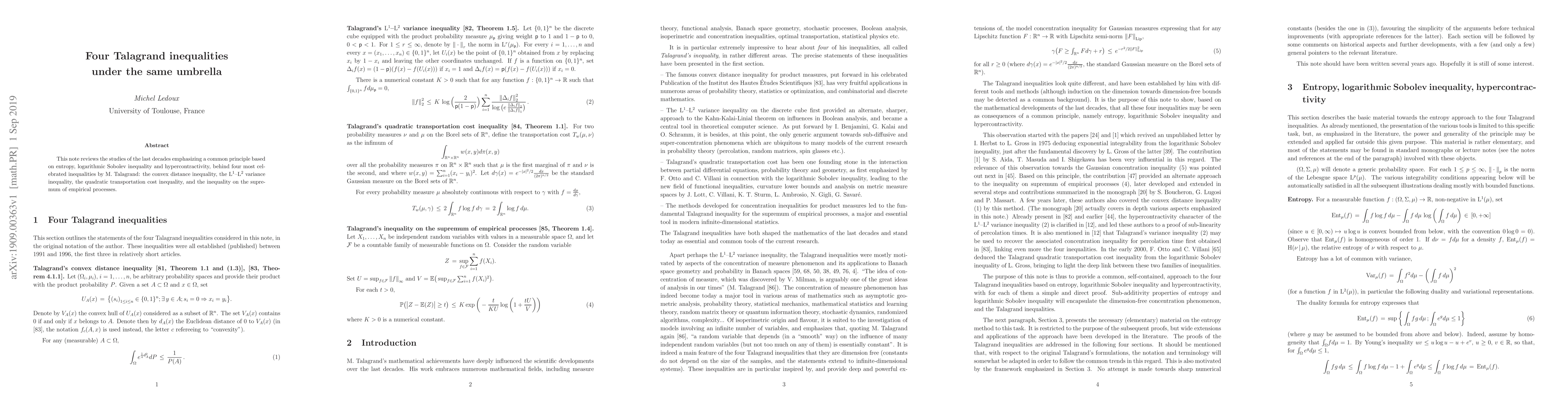 This paper reviews four prominent inequalities by M. Talagrand, highlighting a unifying principle based on entropy, logarithmic Sobolev inequality, and hypercontractivity that underlies them. The inequalities discussed include the convex distance inequality, the $\mathrm{L}^1$-$\mathrm{L}^2$ variance inequality, the quadratic transportation cost inequality, and the supremum of empirical processes inequality.