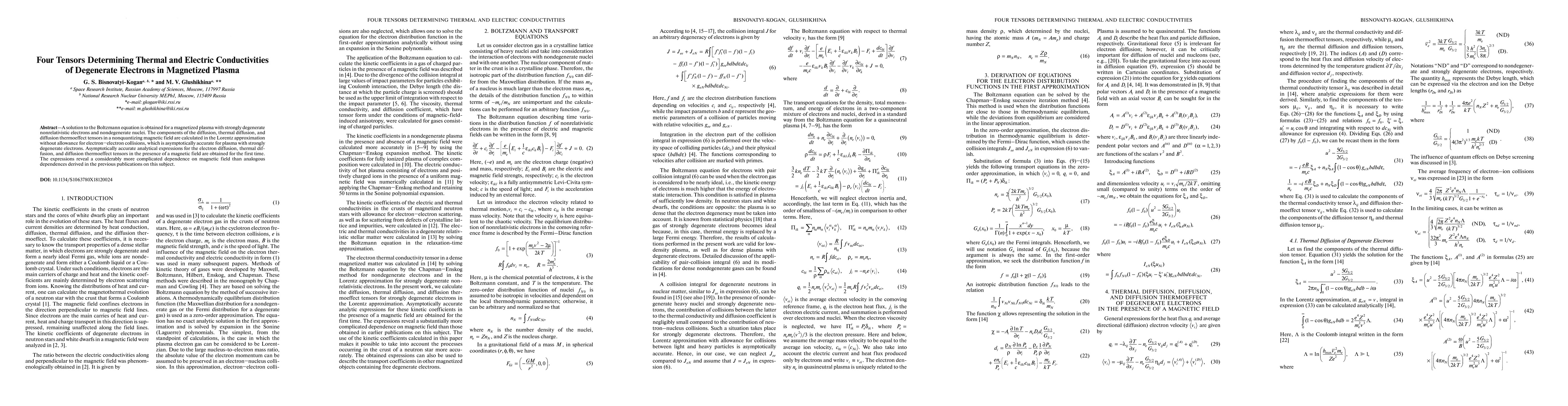 A solution to the Boltzmann equation is obtained for a magnetized plasma with strongly degenerate nonrelativistic electrons and nondegenerate nuclei. The components of the diffusion, thermal diffusion and diffusion thermoeffect tensors in a nonquantizing magnetic field are calculated in the Lorentz approximation without allowance for electron-electron collisions, which is asymptotically accurate for plasma with strongly degenerate electrons. Asymptotically accurate analytical expressions for the electron diffusion, thermal diffusion and diffusion thermoeffect tensors in the presence of a magnetic field are obtained for the first time. The expressions reveal a considerably more complicated dependence on magnetic field than analogous dependences derived in the previous publications on this subject.