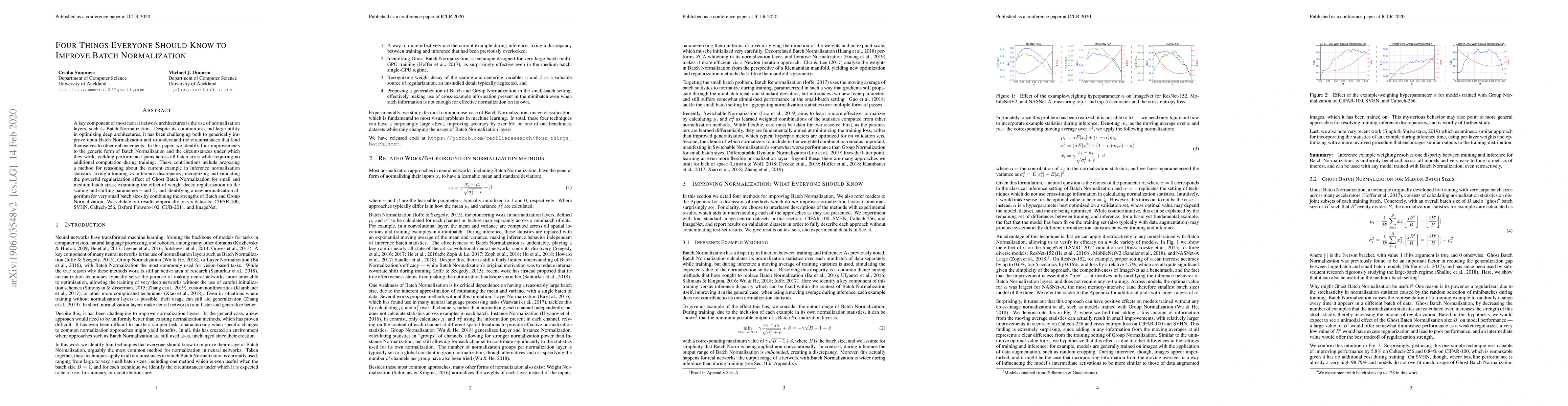 This paper presents four enhancements to Batch Normalization, including addressing the training vs. inference discrepancy, leveraging Ghost Batch Normalization, optimizing weight decay for gamma and beta, and introducing a new normalization algorithm for small batches. The improvements yield performance gains across all batch sizes without extra computation.