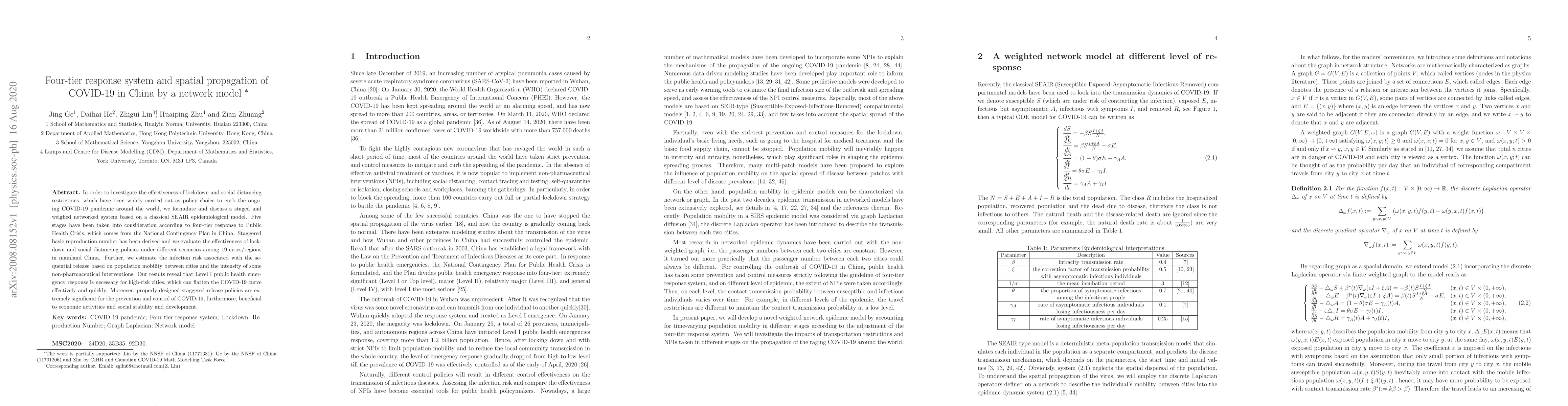 This paper develops a four-tier response network model to assess the impact of lockdown and social distancing on COVID-19 spread in China. Findings suggest that Level I emergency responses are crucial for high-risk areas, while staggered release policies effectively balance pandemic control with economic and social stability.
