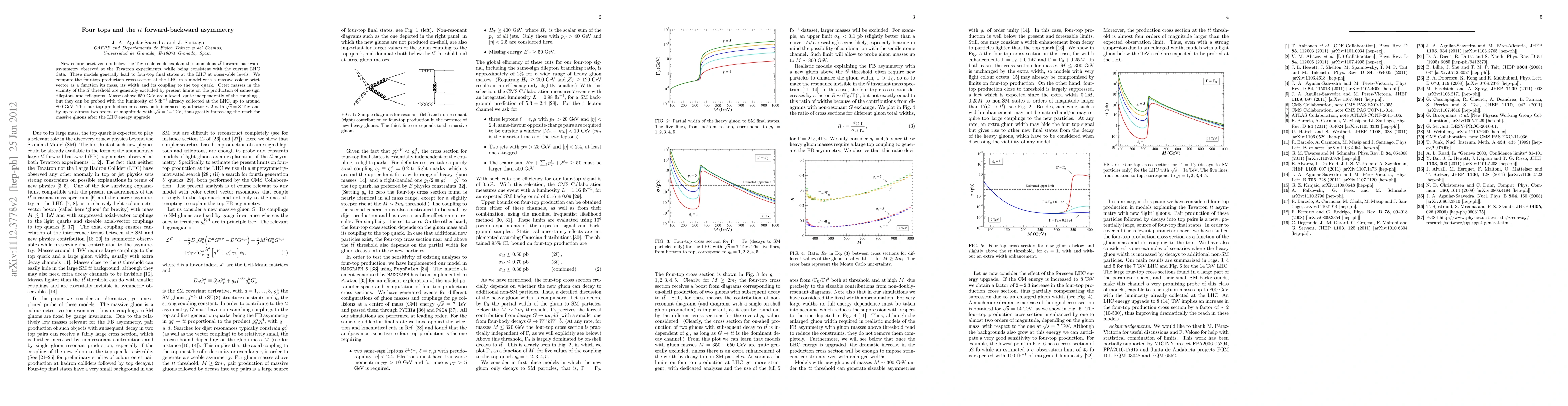 This paper explores how a colour octet vector below the TeV scale can explain the observed t tbar forward-backward asymmetry at the Tevatron, while being consistent with LHC data. The study calculates the four-top production cross section at the LHC, suggesting that masses above 650 GeV for the colour octet vector are viable, and that higher LHC energies will significantly enhance the detection prospects.