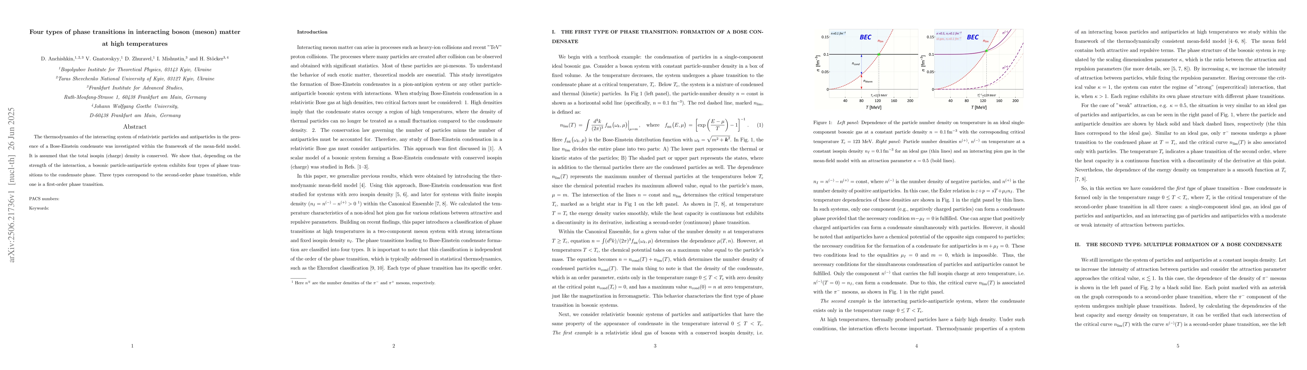 The thermodynamics of the interacting system of relativistic particles and antiparticles in the presence of a Bose-Einstein condensate was investigated within the framework of the mean-field model. It is assumed that the total isospin (charge) density is conserved. We show that, depending on the strength of the interaction, a bosonic particle-antiparticle system exhibits four types of phase transitions to the condensate phase. Three types correspond to the second-order phase transition, while one is a first-order phase transition.