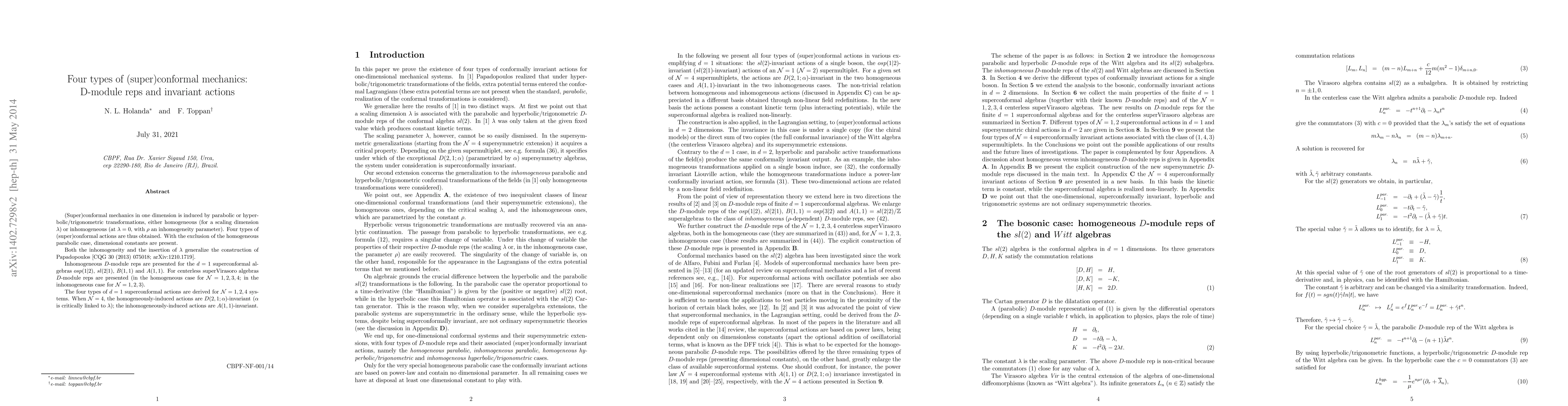 This paper explores four types of (super)conformal mechanics in one dimension, induced by parabolic or hyperbolic transformations, and presents inhomogeneous $D$-module representations for various $d=1$ superconformal algebras. The study derives four types of $d=1$ superconformal actions for ${\cal N}=1,2,4$ systems, with specific invariance properties for ${\cal N}=4$ actions.