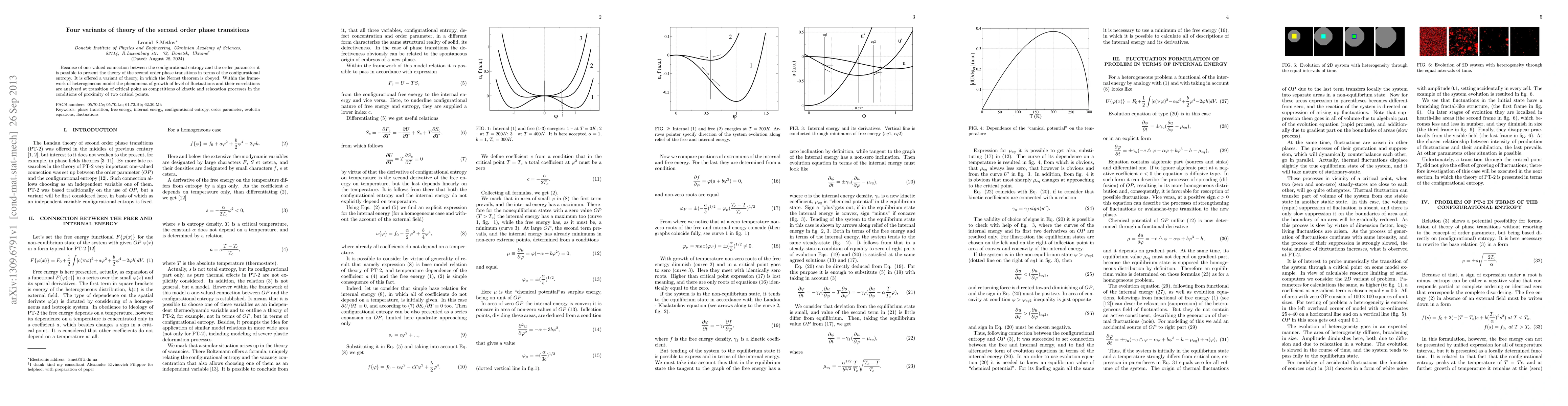 Because of one-valued connection between the configurational entropy and the order parameter it is possible to present the theory of the second order phase transitions in terms of the configurational entropy. It is offered a variant of theory, in which the Nernst theorem is obeyed. Within the framework of heterogeneous model the phenomena of growth of level of fluctuations and their correlations are analyzed at transition of critical point as competitions of kinetic and relaxation processes in the conditions of proximity of two critical points.