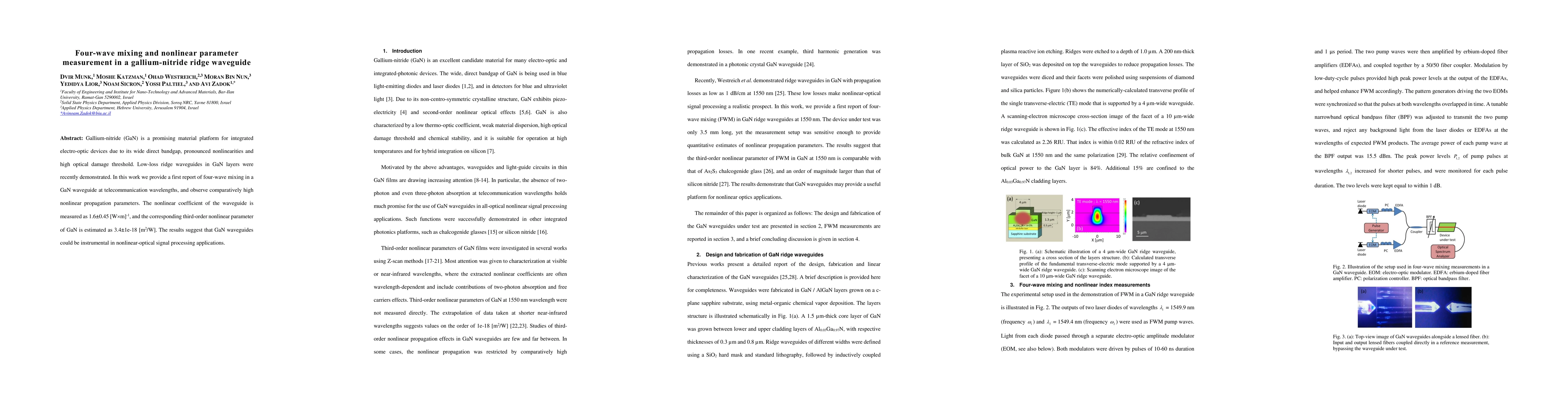 This paper reports the first observation of four-wave mixing in gallium-nitride (GaN) ridge waveguides at telecommunication wavelengths, demonstrating high nonlinear propagation parameters. The nonlinear coefficient and third-order nonlinear parameter of GaN were measured, indicating potential for GaN waveguides in nonlinear optical signal processing.