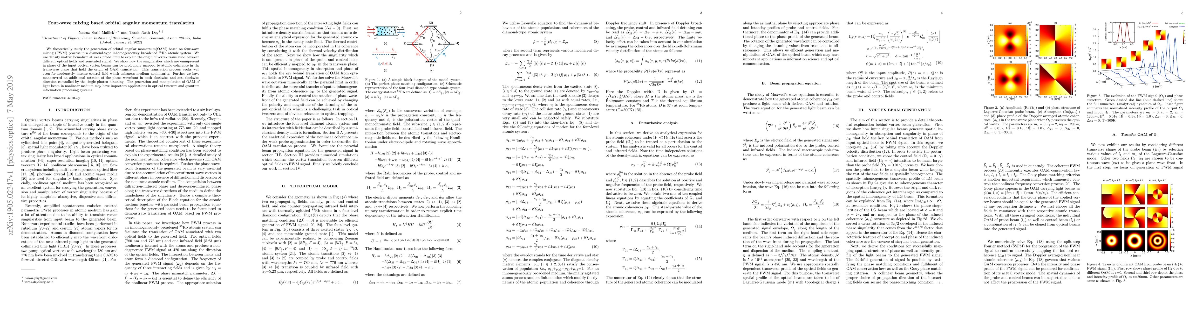 We theoretically study the generation of orbital angular momentum(OAM) based on four-wave mixing (FWM) process in a diamond-type inhomogeneously broadened $^{85}$Rb atomic system. We use density matrix formalism at weak probe limit to explain the origin of vortex translation between different optical fields and generated signal. We show how the singularities which are omnipresent in phase of the input optical vortex beams can be profoundly mapped to atomic coherence in the transverse plane that hold the origin of OAM translation. This translation process works well even for moderately intense control field which enhances medium nonlinearity. Further we have manoeuvred an additional rotation of the phase wavefront in both clockwise and anti-clockwise direction controlled by the single photon detuning. The generation and manipulation of OAM of light beam in nonlinear medium may have important applications in optical tweezers and quantum information processing systems.