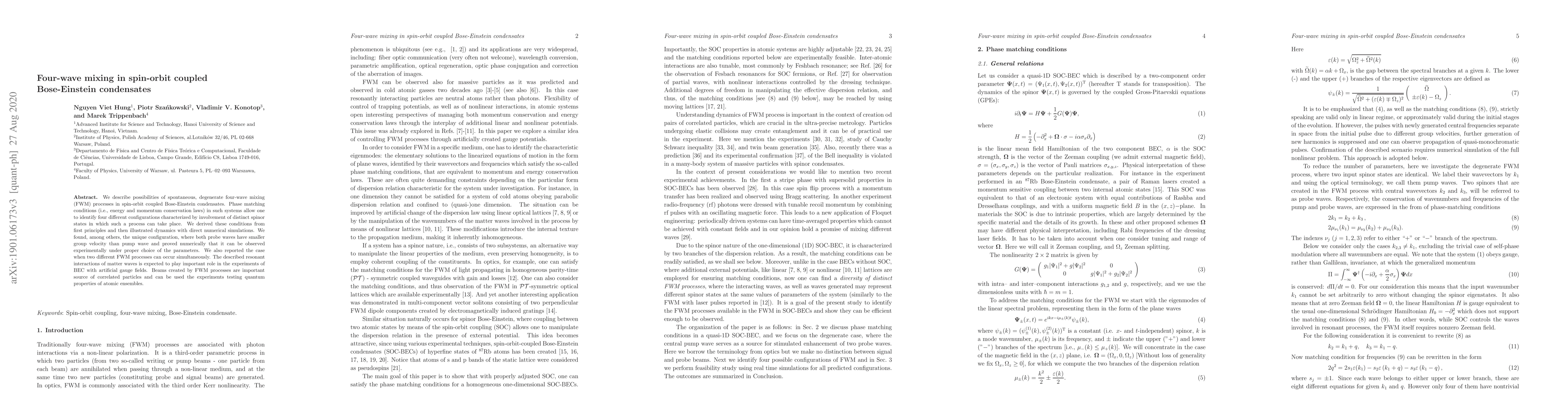 This paper explores spontaneous, degenerate four-wave mixing in spin-orbit coupled Bose-Einstein condensates, identifying four distinct configurations through phase matching conditions. Numerical simulations confirm the feasibility of observing unique configurations experimentally, highlighting their potential in BEC experiments with artificial gauge fields and as a source of correlated particles.